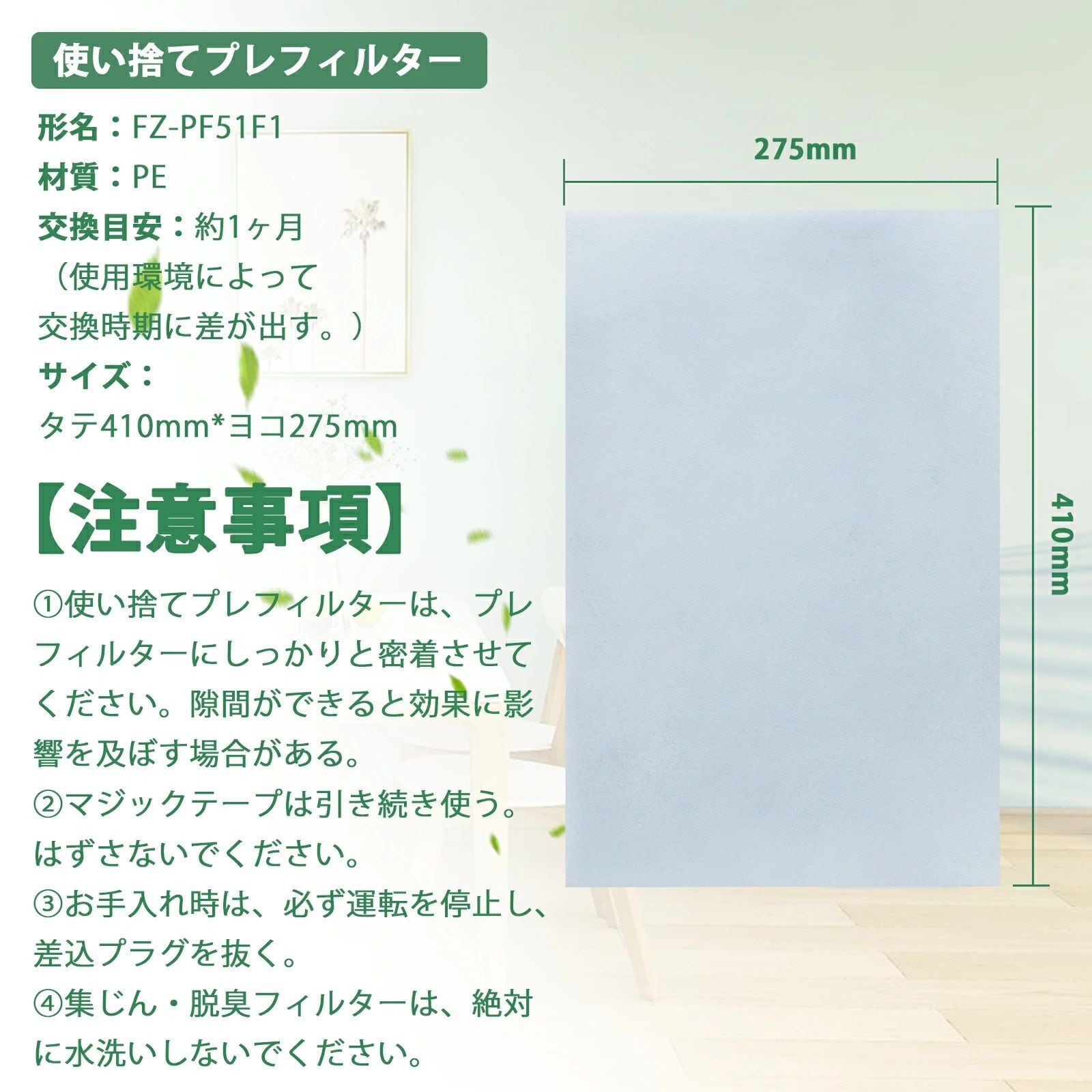 使い捨てプレフィルター 寸法(縦×幅):410×275mm
