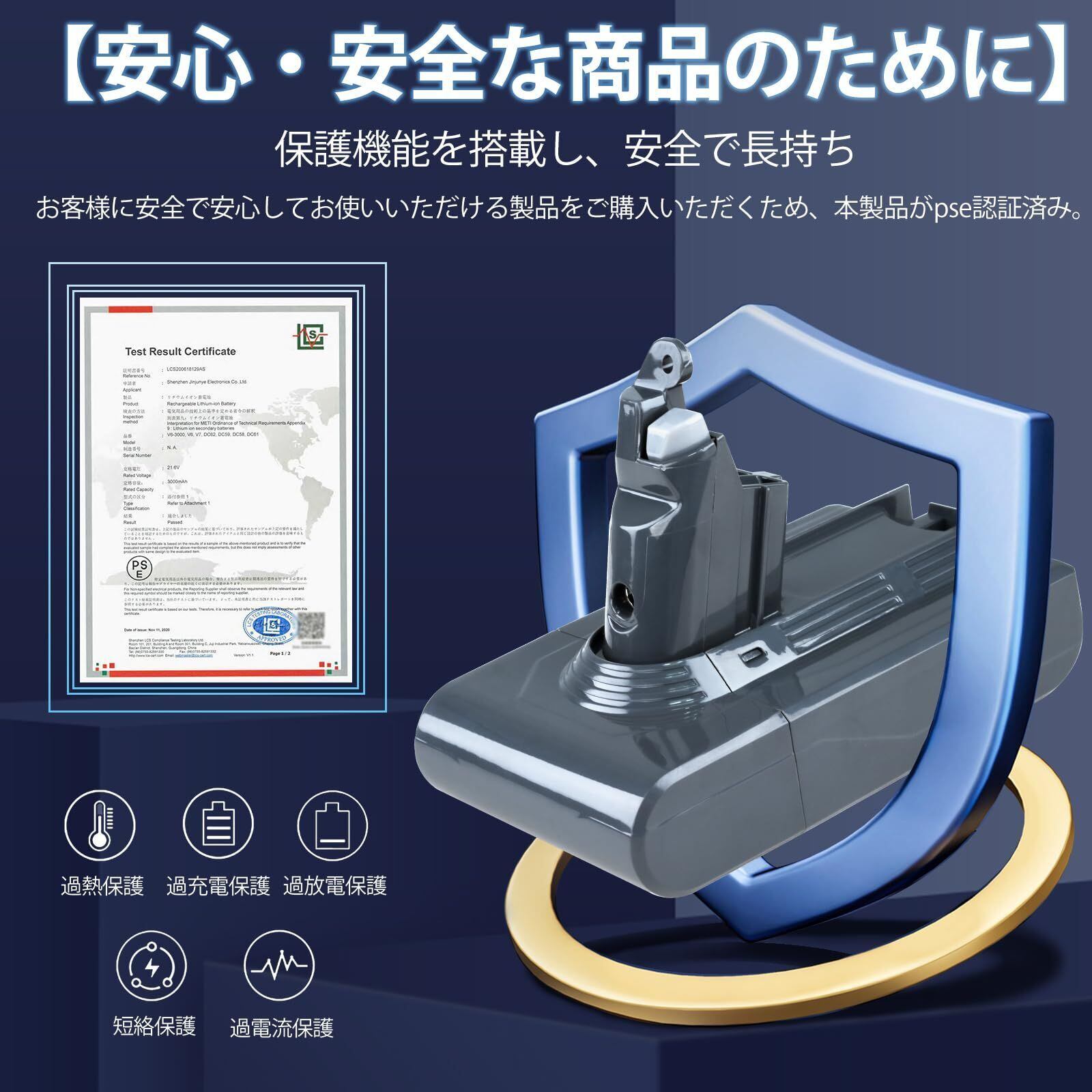 バッテリー性能 PSE認証済み。過電流・過充電・過放電・短絡・過熱保護を搭載。
