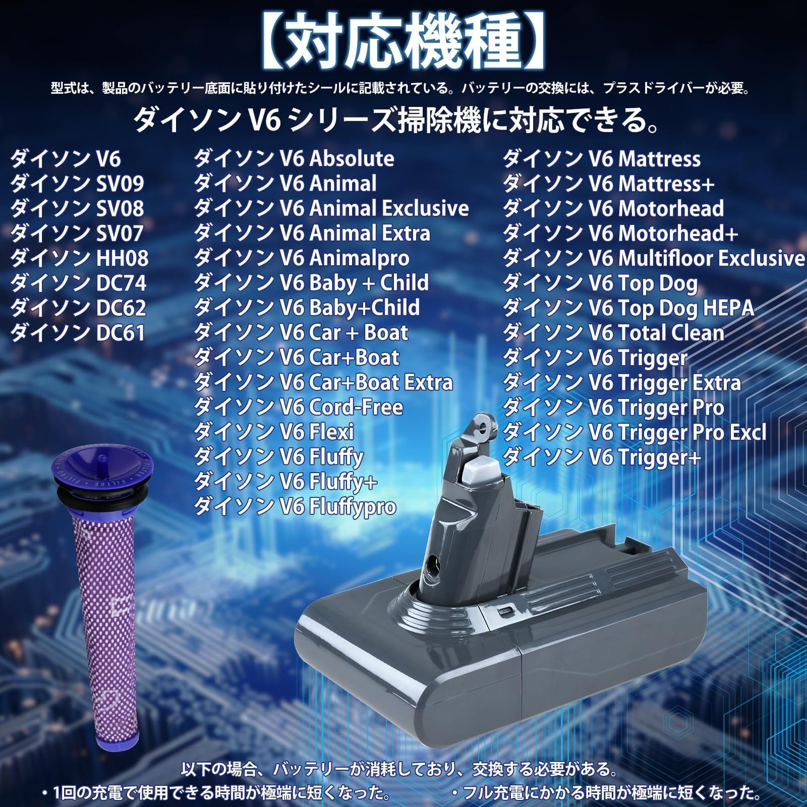 対応機種(基本型番) ダイソン V6 / DC62 / DC61 / DC74 / SV07 / SV08 / SV09 / HH08