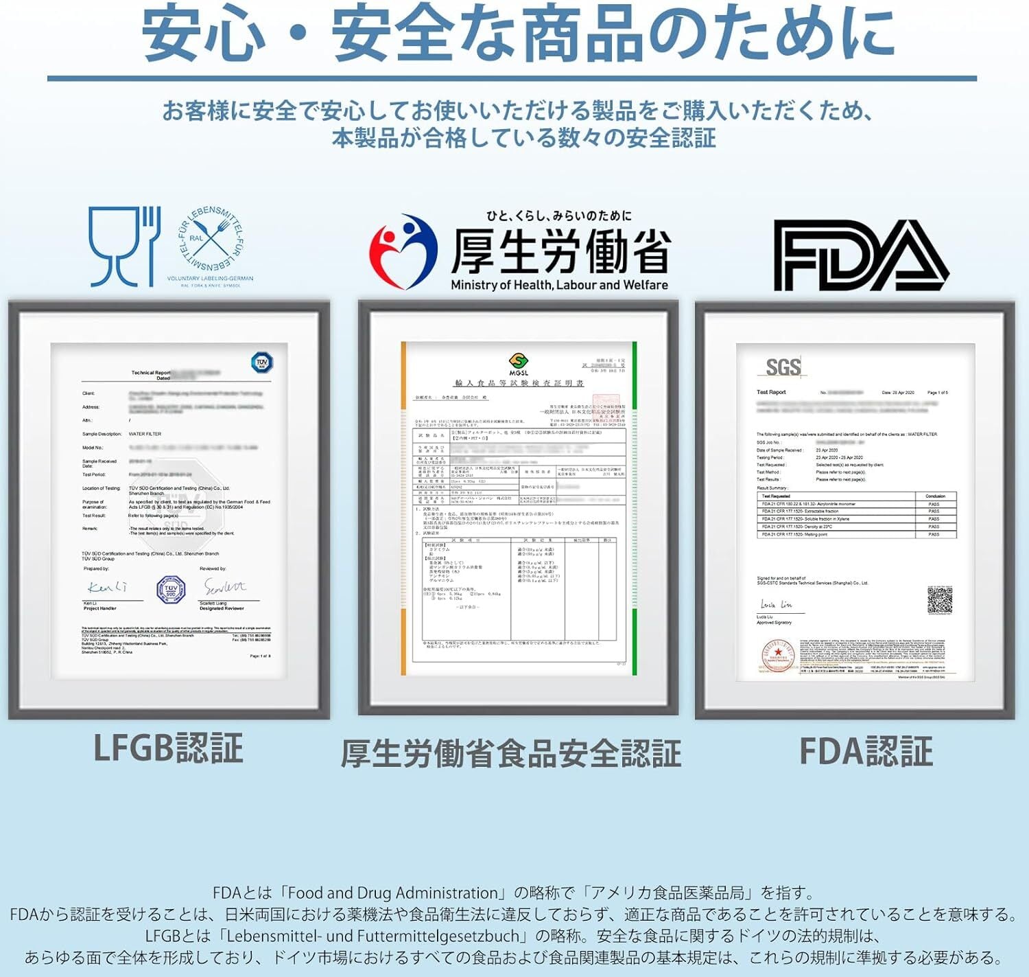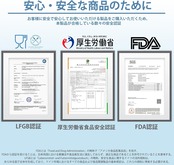 FDA認証、LFGB認証など各種国際安全認証取得済み。