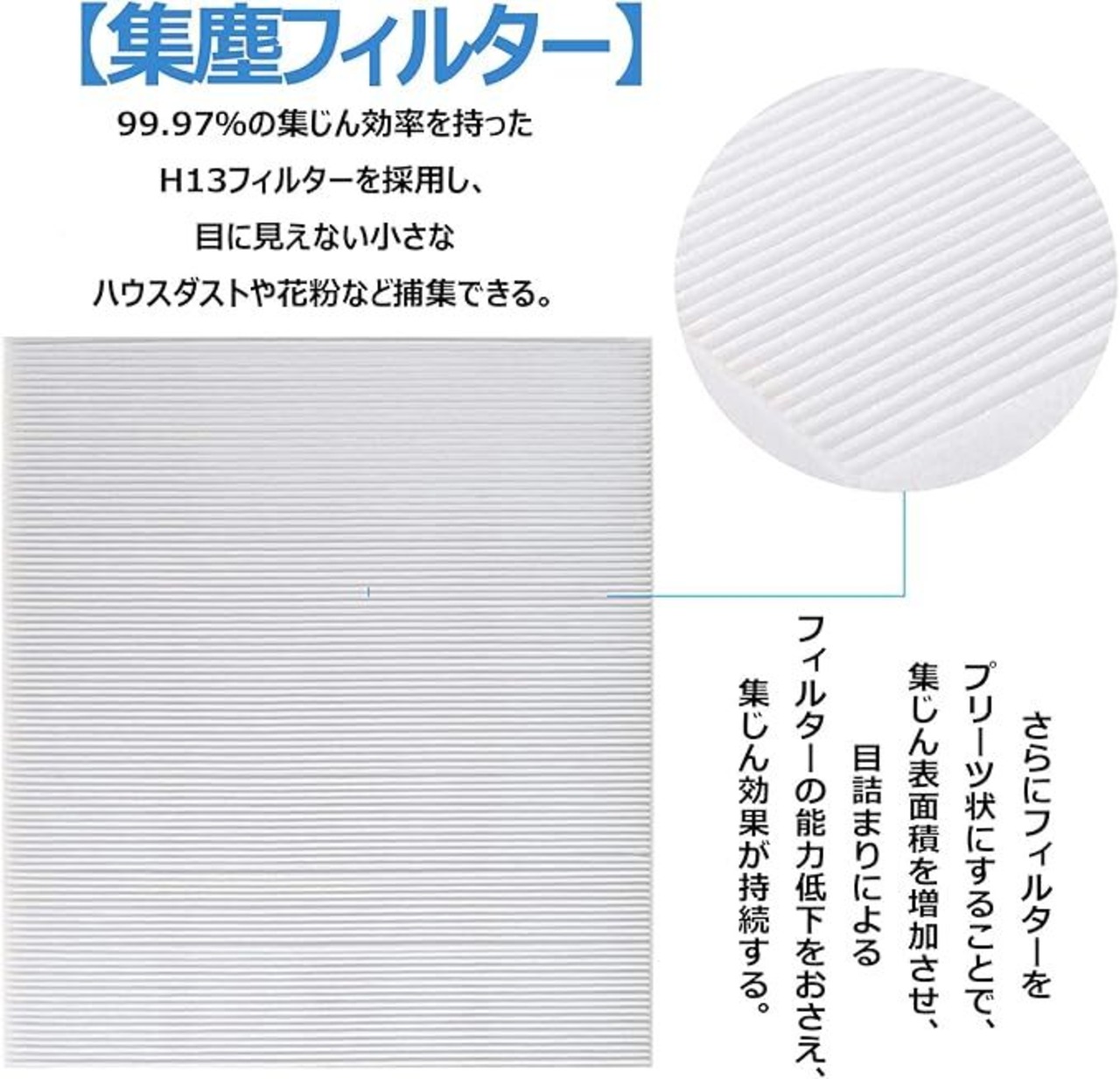 ・プリーツ構造により集じん面積を拡大し、目詰まりによる性能低下を抑制。