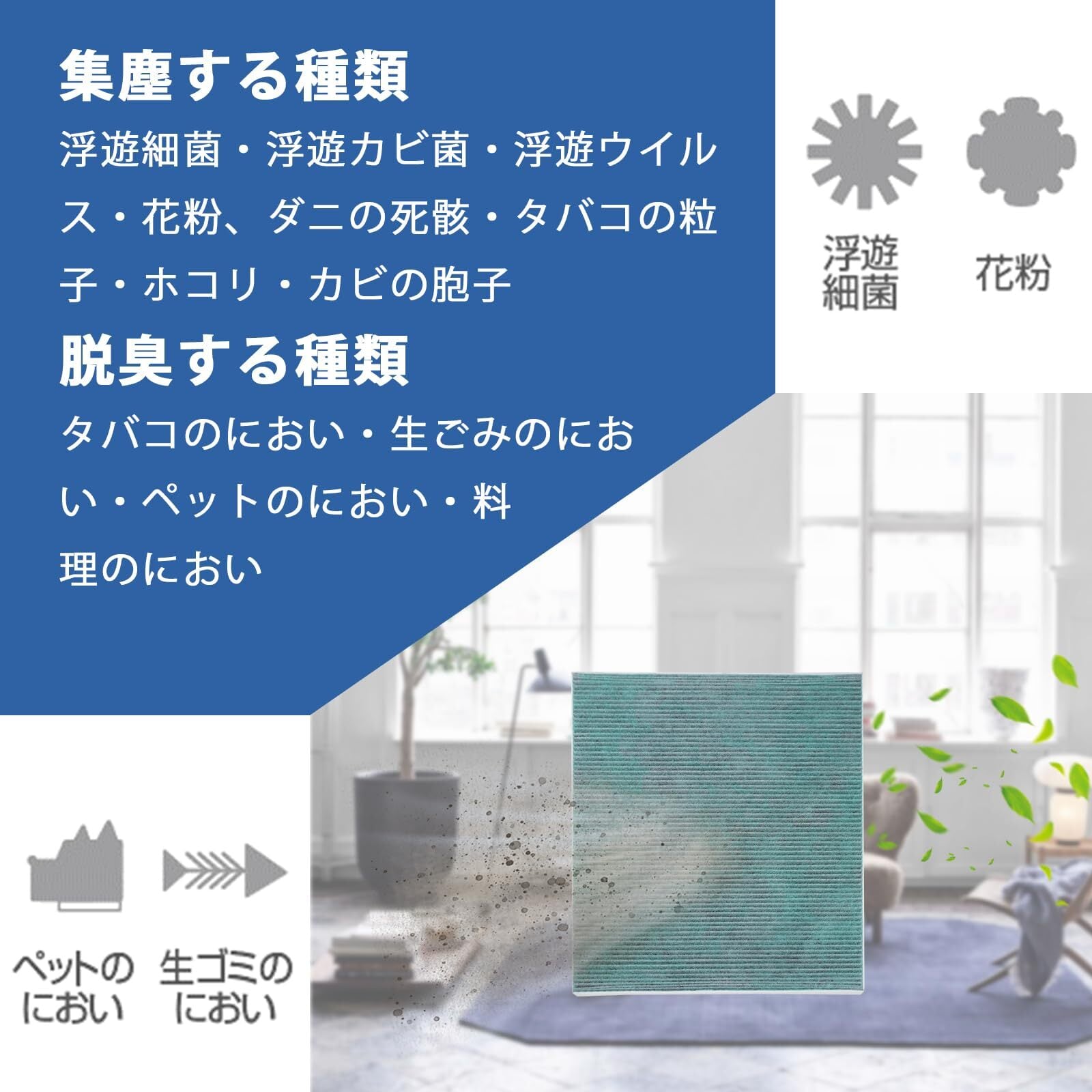 ・集じん機能:ホコリ、花粉、ダニの死がいなどを強力に捕集。