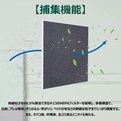 集じんフィルターに添着したバイオ除菌、スーパーアレルパスターの働きで、空気中に浮遊している細かい粒子(埃、花粉、細菌、カビ菌、タバコの煙、ダニの死骸など)を濾過し、室内の空気をきれいにする。