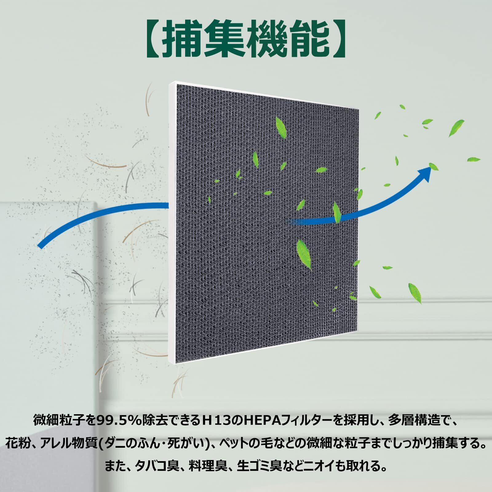 脱臭フィルターに内蔵活性炭、室内のペット臭、体臭、アンモニア臭、生ごみ臭、料理臭、タバコの臭いなど気になるニオイの元を吸着する。