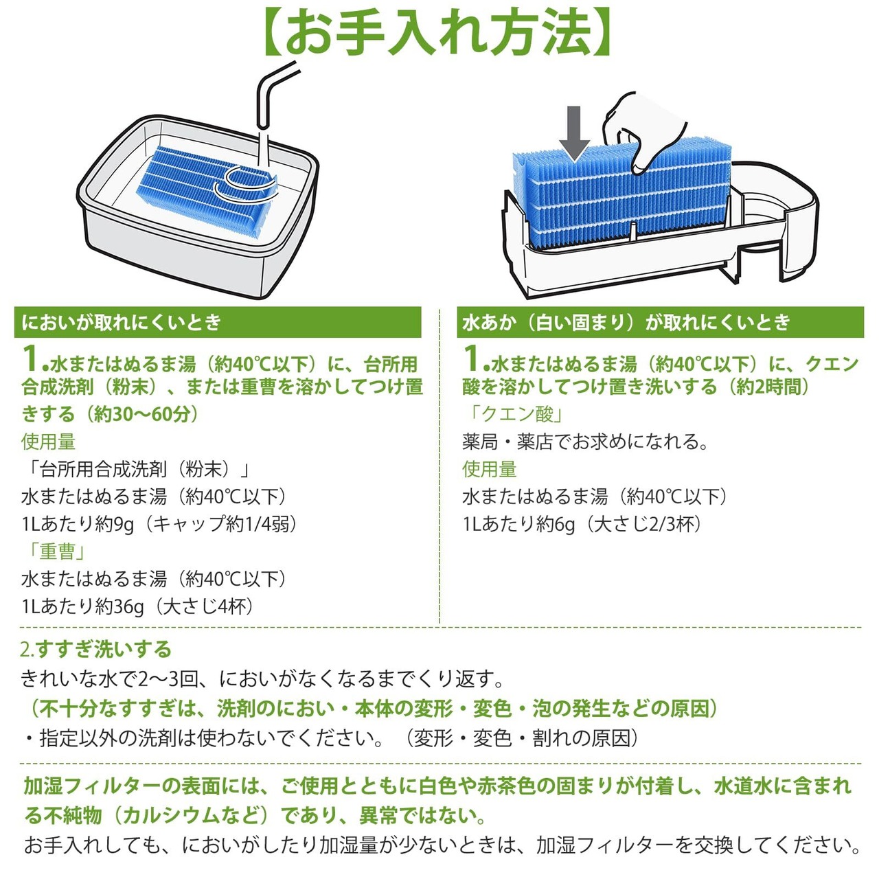 2週間に1回。お手入れしても、においがしたり加湿量が少ないときは、加湿フィルターを交換してください。