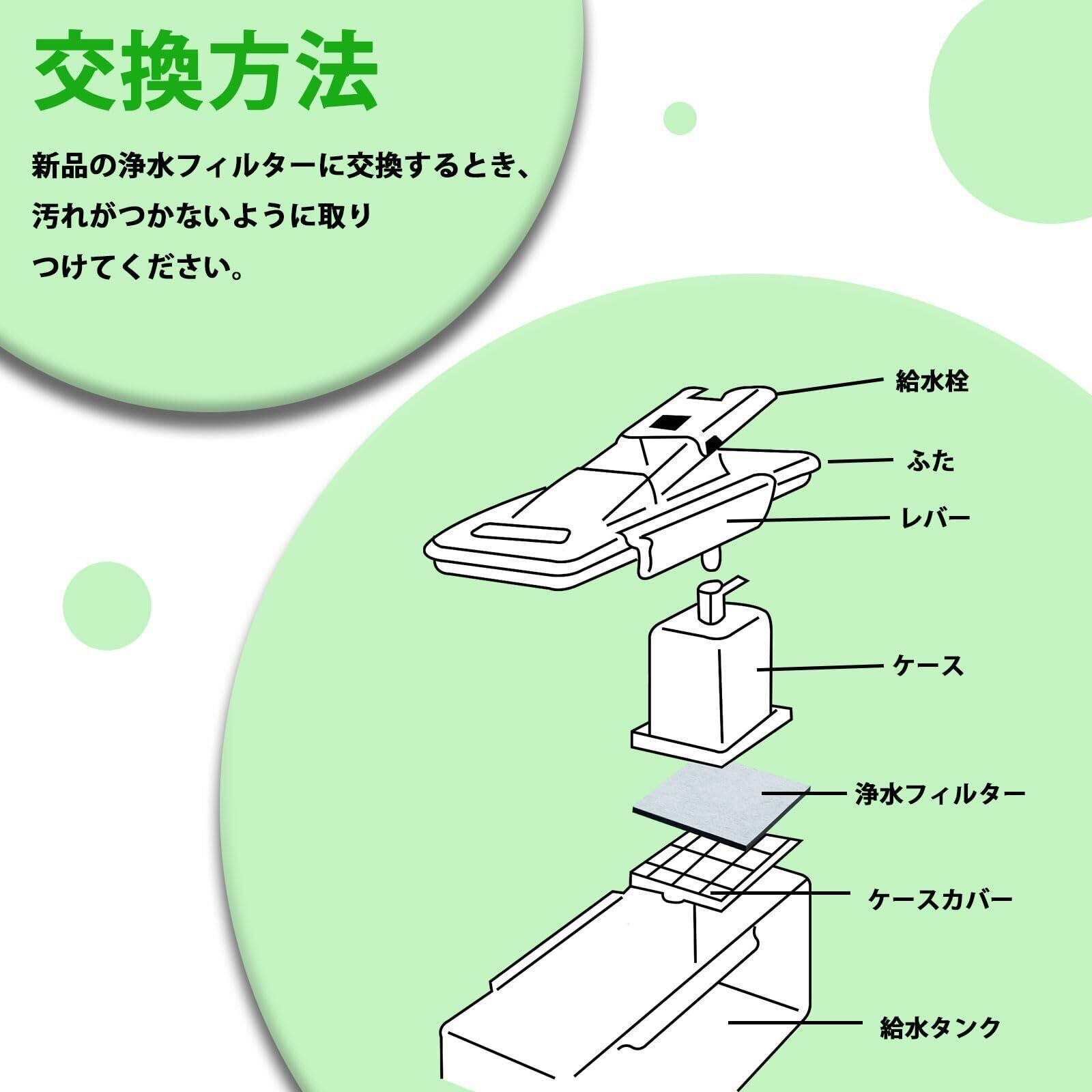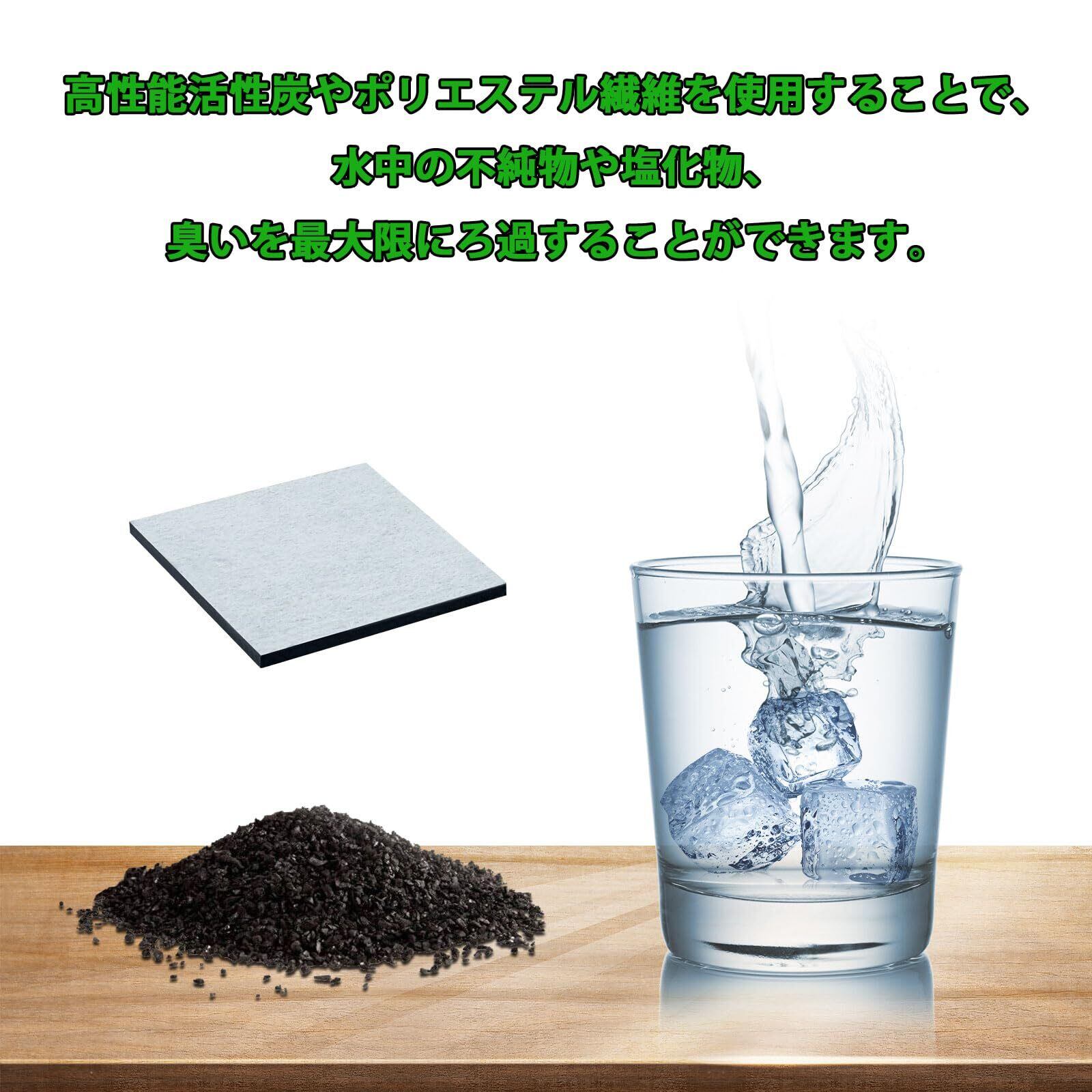 ・機能:水道水をろ過して水中に含まれる不純物を除去する。カルキ臭を低減する。