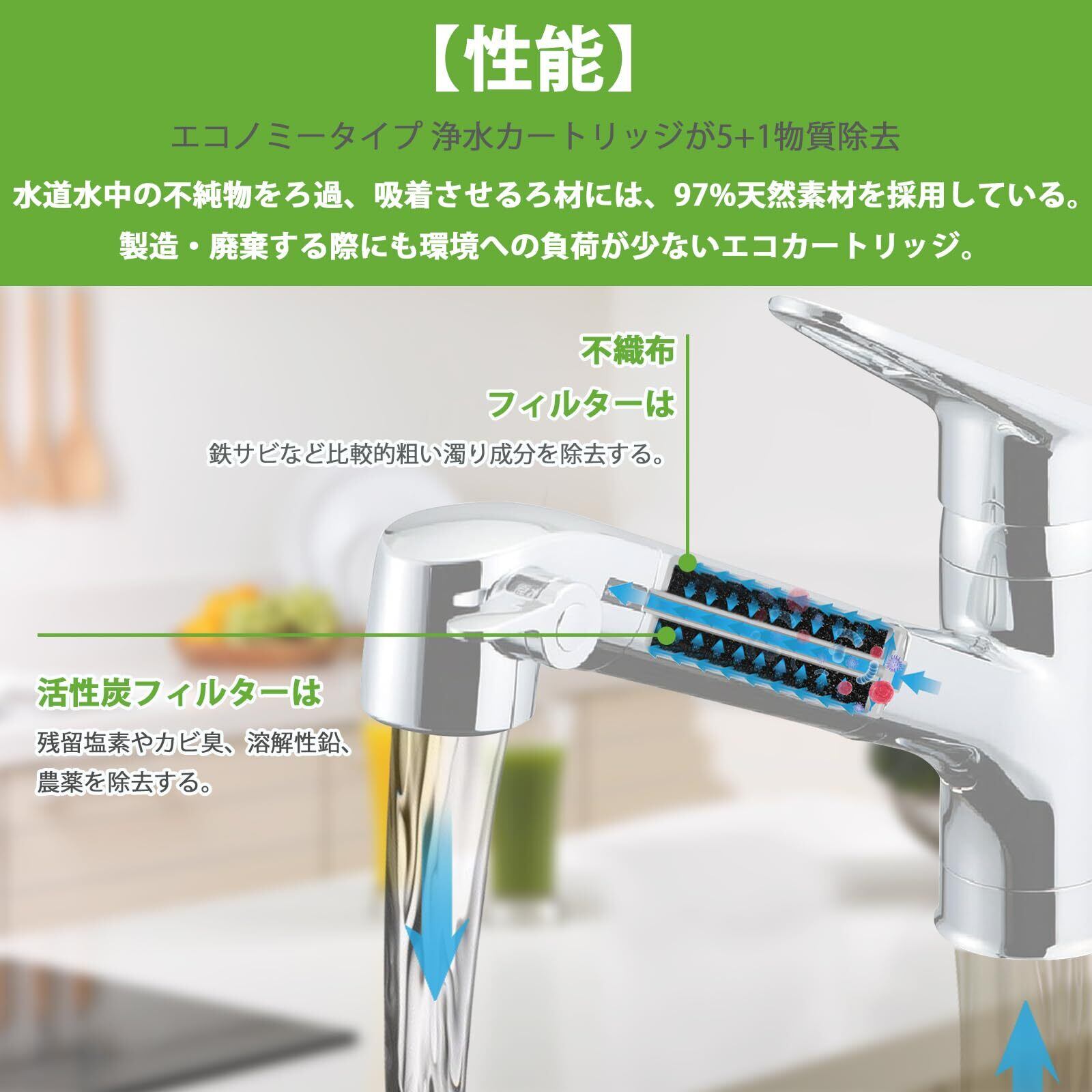 ●エコノミータイプ 浄水カートリッジが5+1物質除去。不織布フィルターは鉄サビなど比較的粗い濁り成分を除去する。