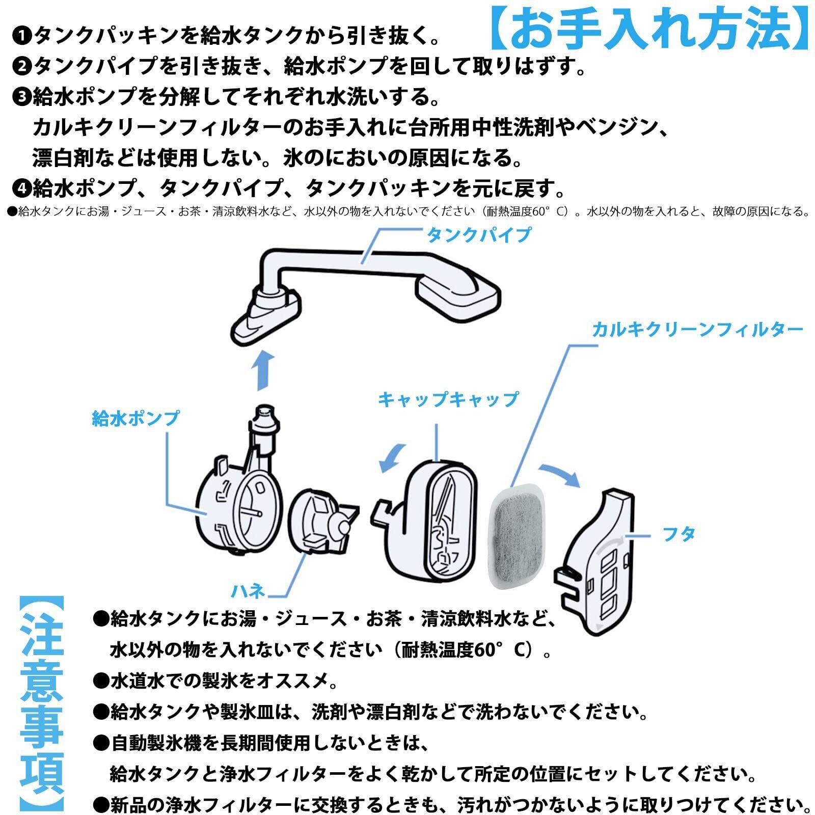 4.カルキクリーンフィルターのお手入れに台所用中性洗剤やベンジン、漂白剤などは使用しない。氷のにおいの原因になる。給水ポンプ、タンクパイプ、タンクパッキンを元に戻す。