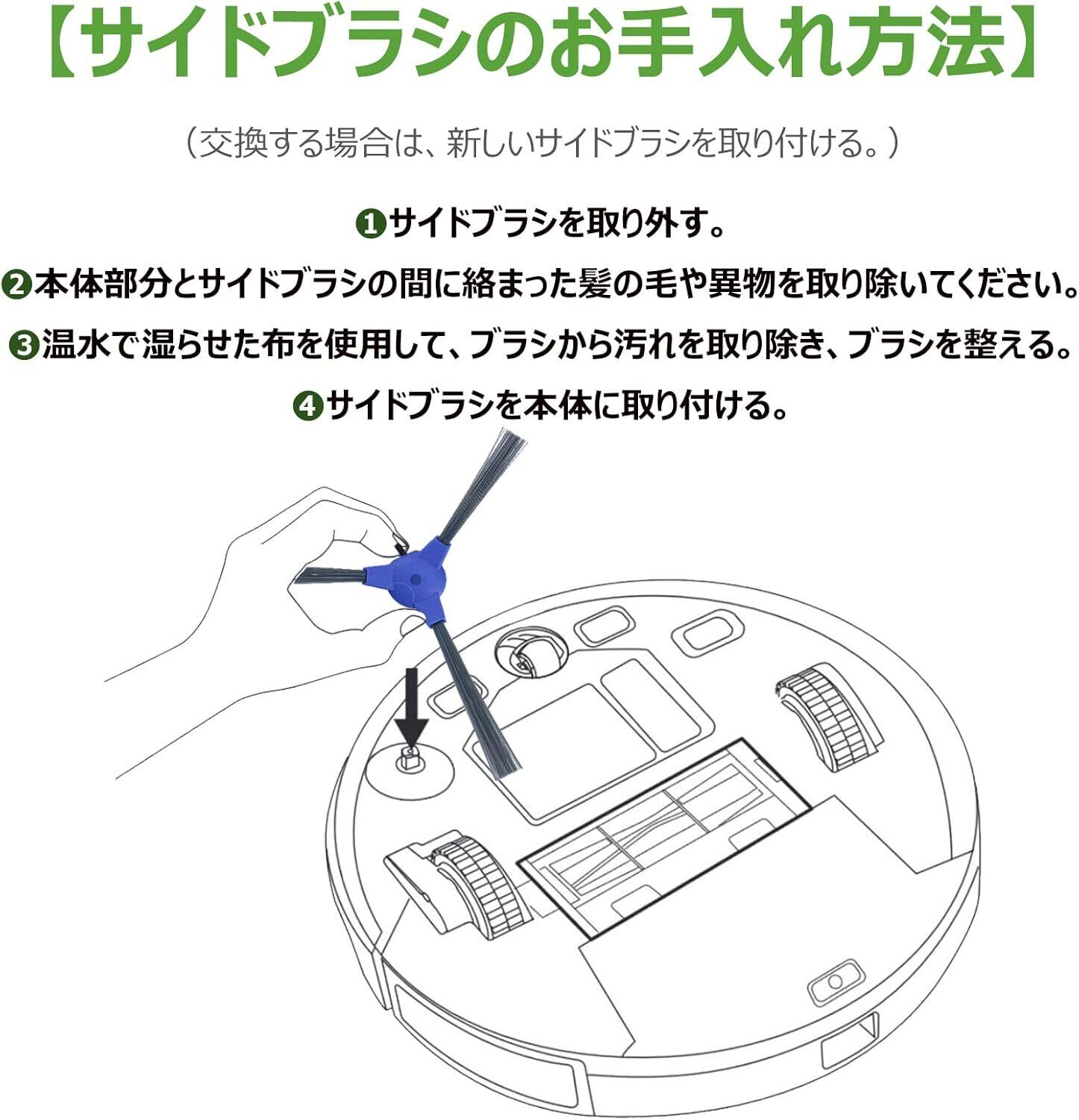 【お手入れ目安】フィルターセットは週に1回。サイドブラシは1ヶ月に1回。髪の毛のような異物はサイドブラシに絡まりやすく、ホコリがこびりつく場合がある。定期的に清掃を行ってください。