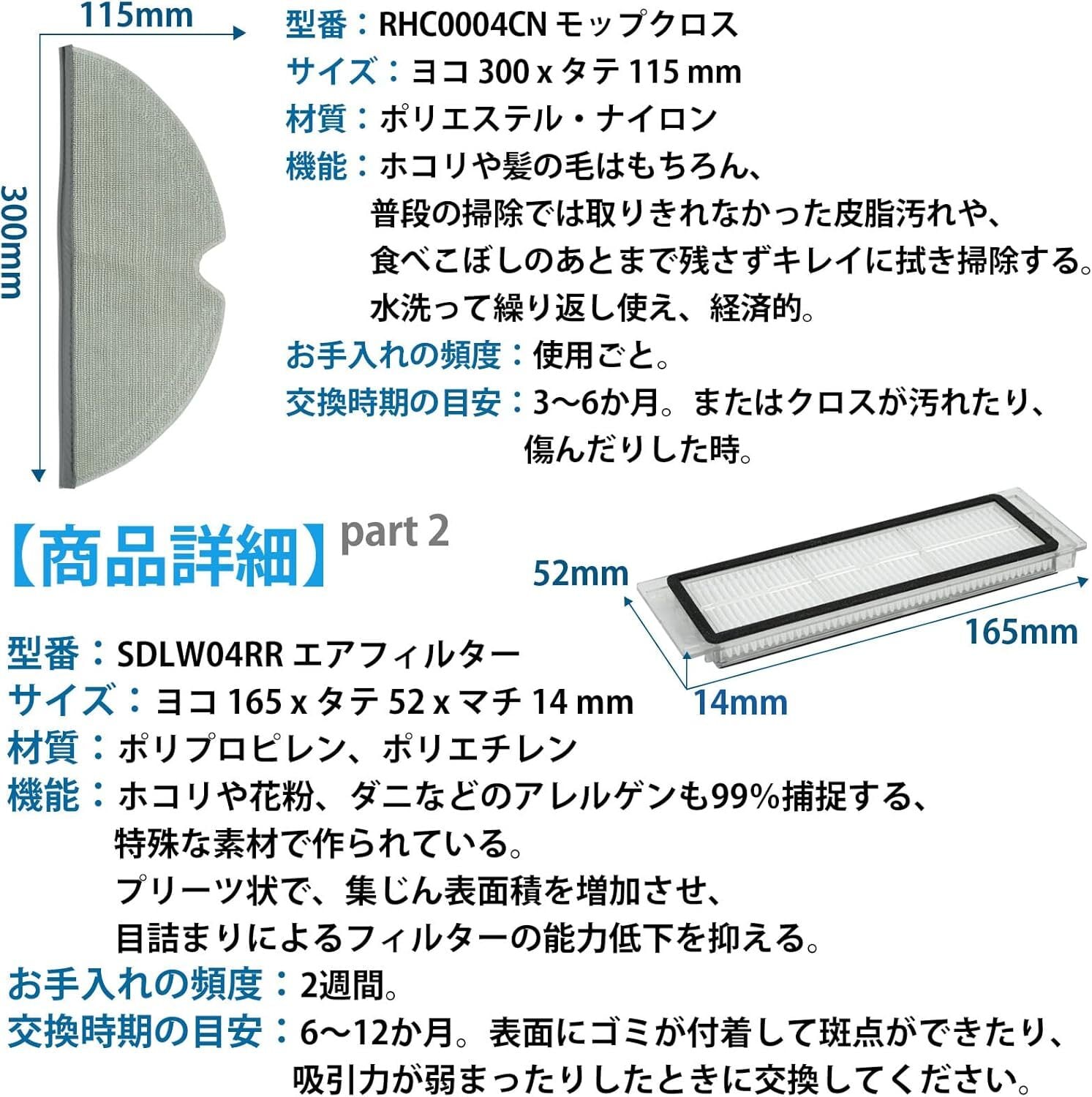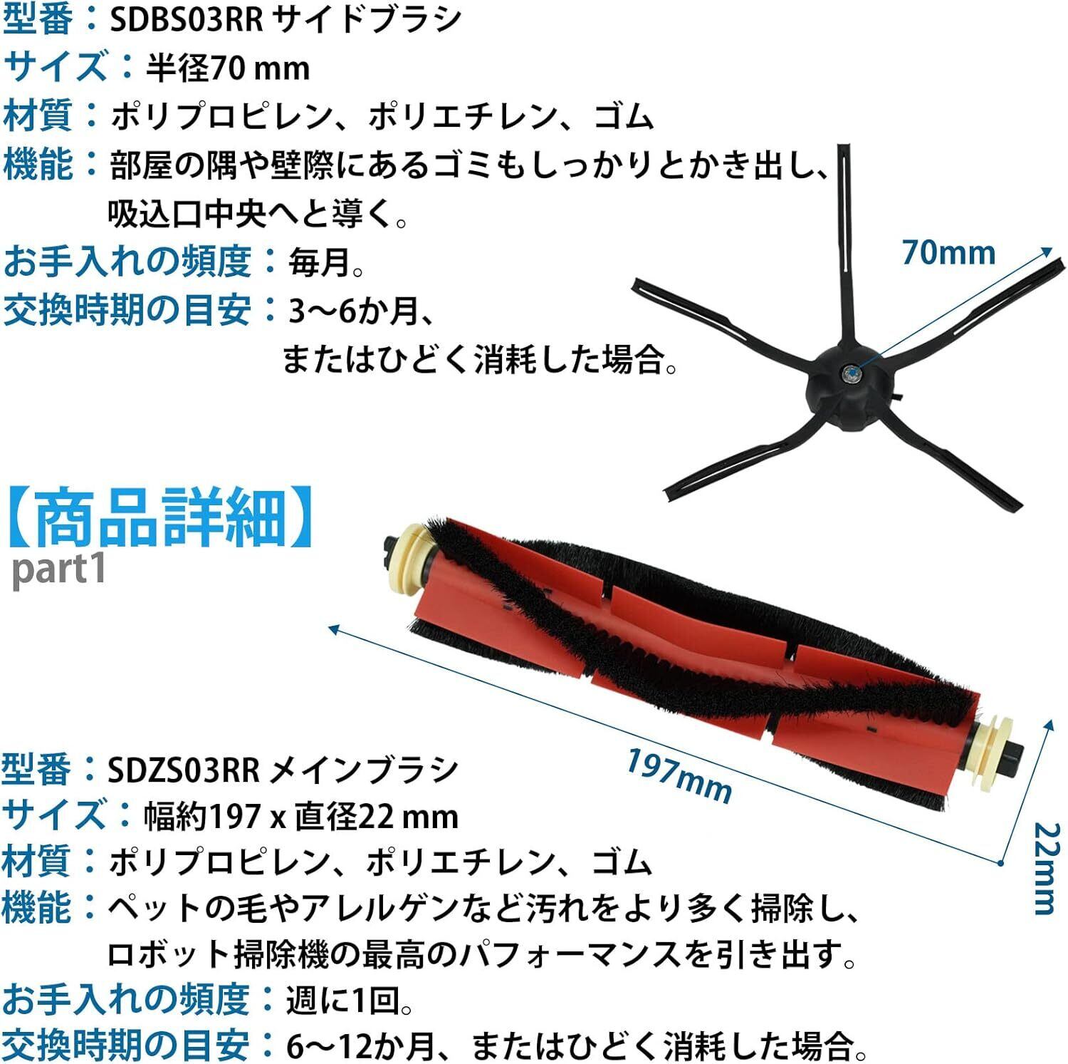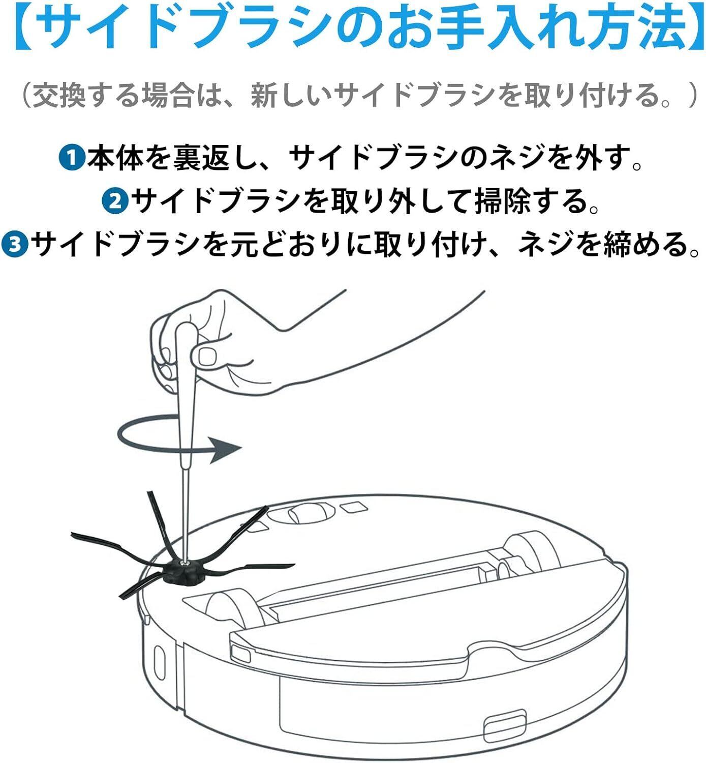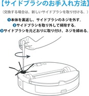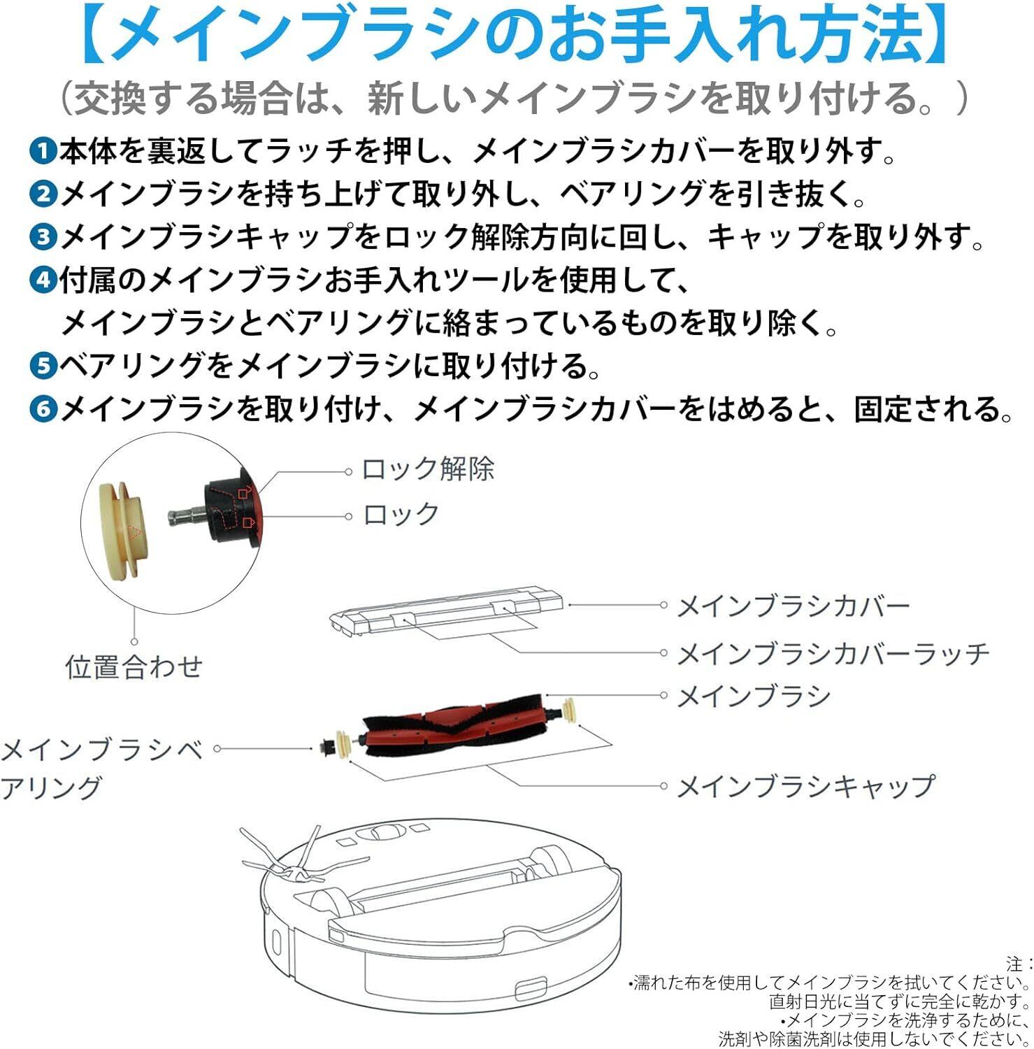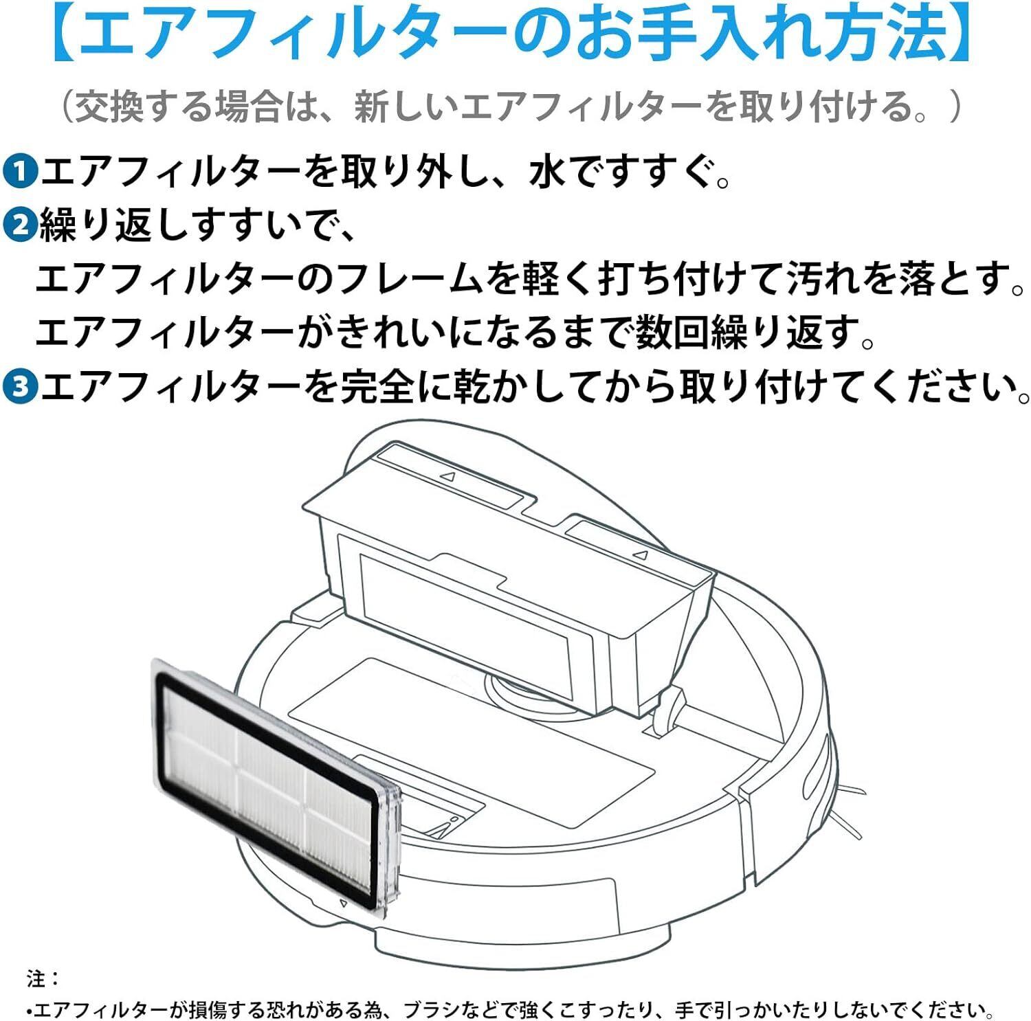 【お手入れ目安】メインブラシ、エアフィルターは2週間、サイドブラシは毎月、モップクロスは使用ごと。掃除機をピーク性能で動作させるためには、消耗品を定期的に交換してください。使用状況により、交換時期の目安は異なるが、摩耗した場合は部品を交換する必要がある。