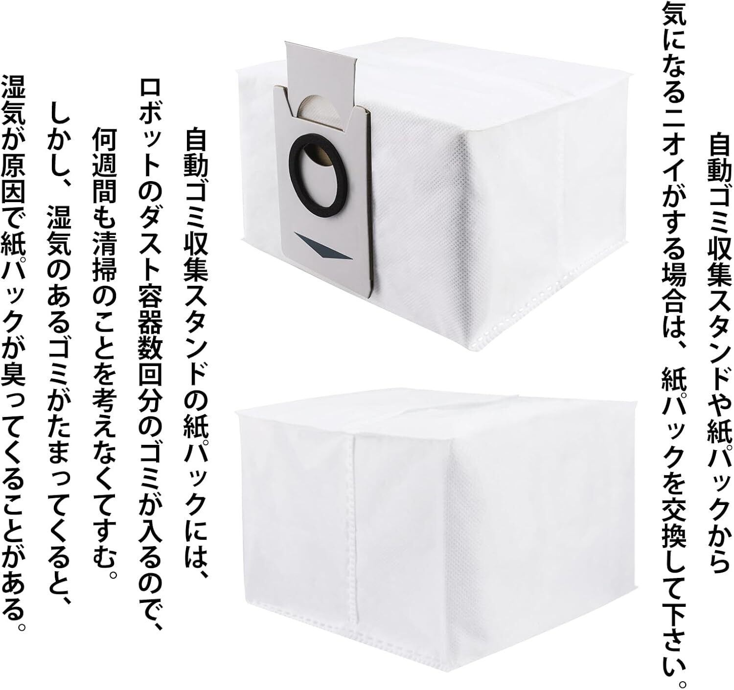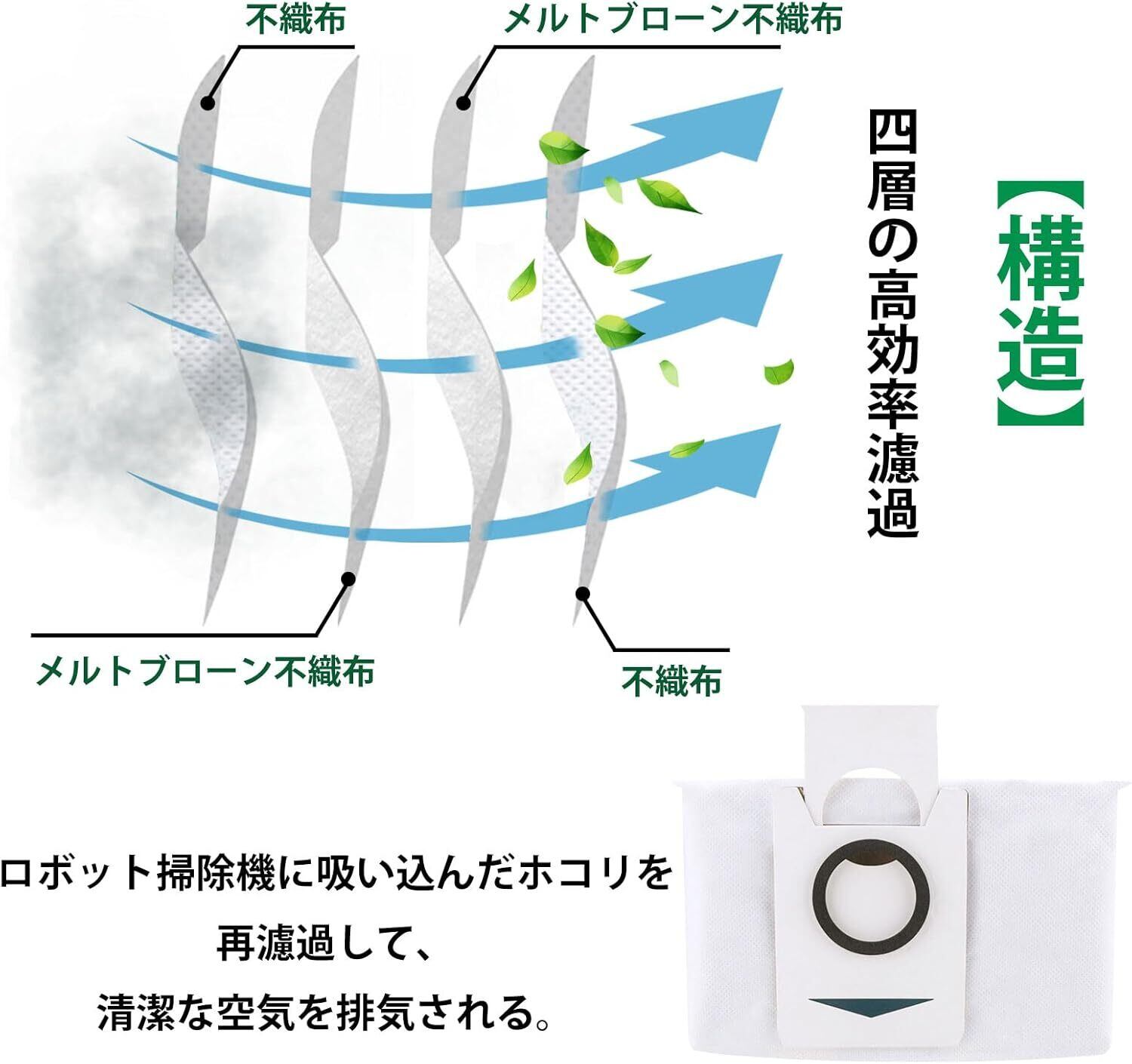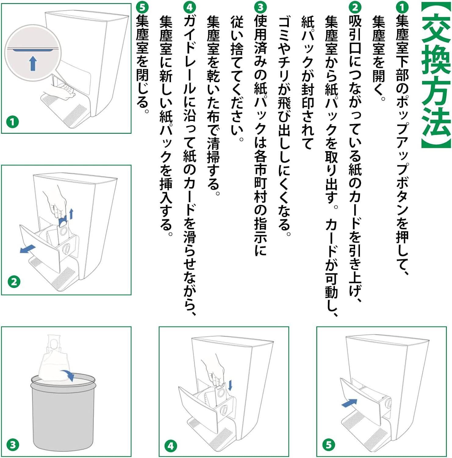 【性能】ロボット掃除機に吸い込んだホコリを濾しとり、自動ゴミ収集スタンドにセットしてある紙パック内に集めて、空気のみ紙パックを通して排気される。また、エコ紙パックはプラスチック資材を一切使用していない。環境に配慮した設計で、燃えるゴミとしてそのまま捨てることが可能。