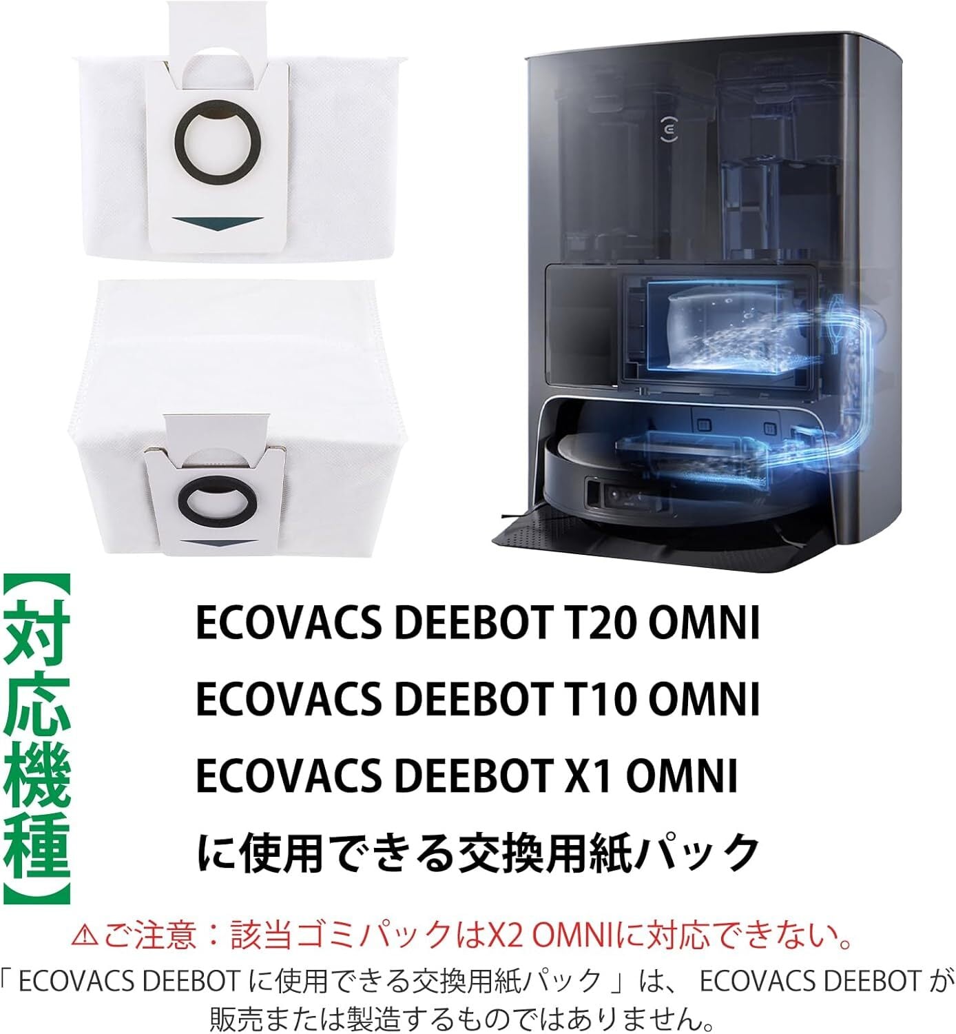 【対応機種】 DEEBOT T20 OMNI / DEEBOT T10 OMNI / DEEBOT X1 OMNI に使用できる交換用紙パック。「 ECOVACS DEEBOT に使用できる交換用紙パック 」は、 ECOVACS DEEBOT が販売または製造するものではない。?ご注意:該当ゴミパックはX2 OMNIに対応できない。