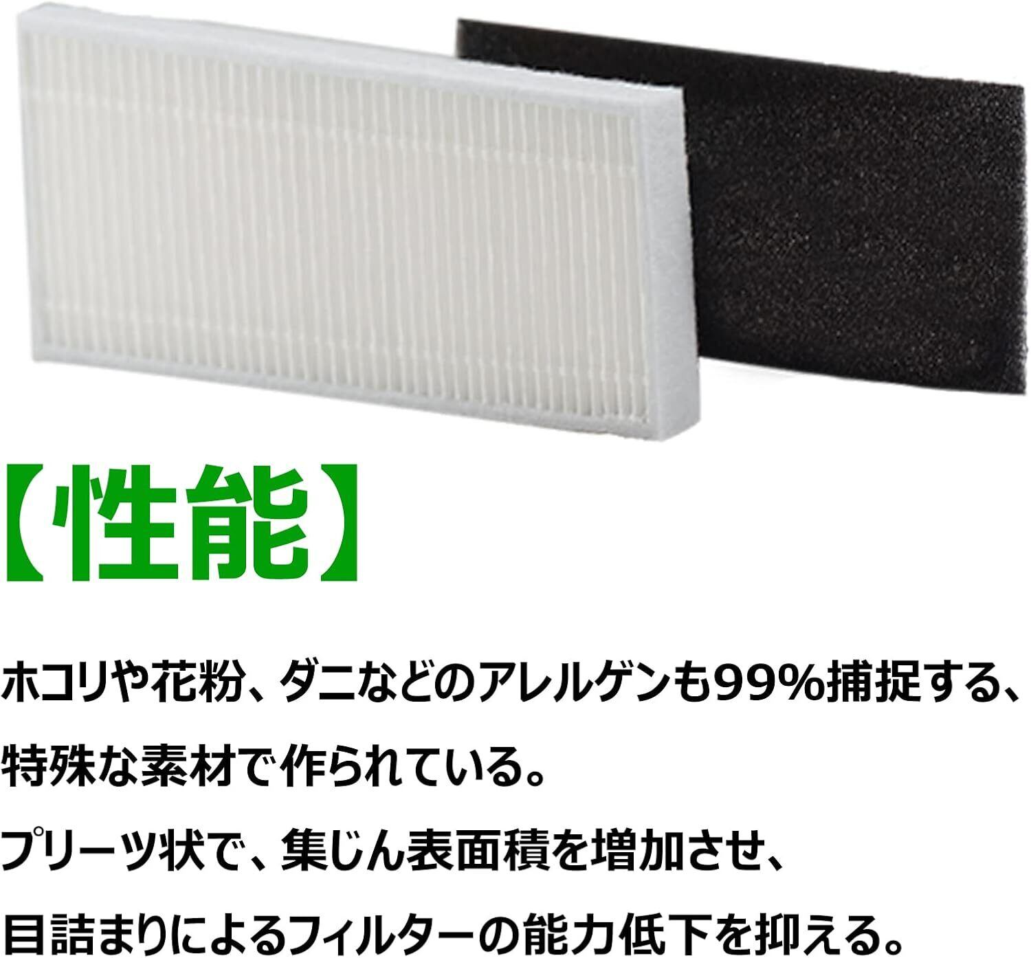 【性能】フィルターセットはホコリや花粉、ダニなどのアレルゲンも99%捕捉する、特殊な素材で作られている。プリーツ状で、集じん表面積を増加させ、目詰まりによるフィルターの能力低下を抑える。