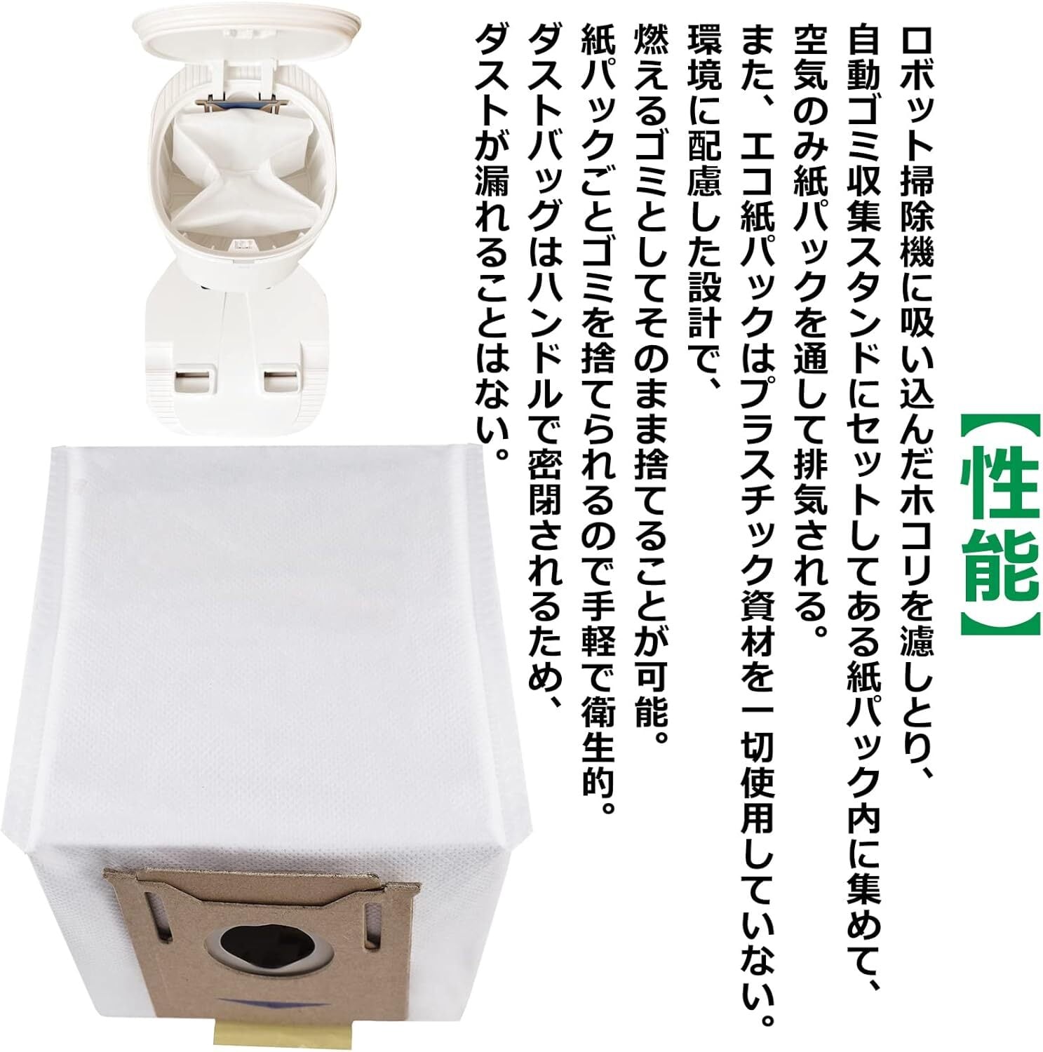 【性能】ロボット掃除機に吸い込んだホコリを濾しとり、自動ゴミ収集スタンドにセットしてある紙パック内に集めて、空気のみ紙パックを通して排気される。また、エコ紙パックはプラスチック資材を一切使用していない。環境に配慮した設計で、燃えるゴミとしてそのまま捨てることが可能。