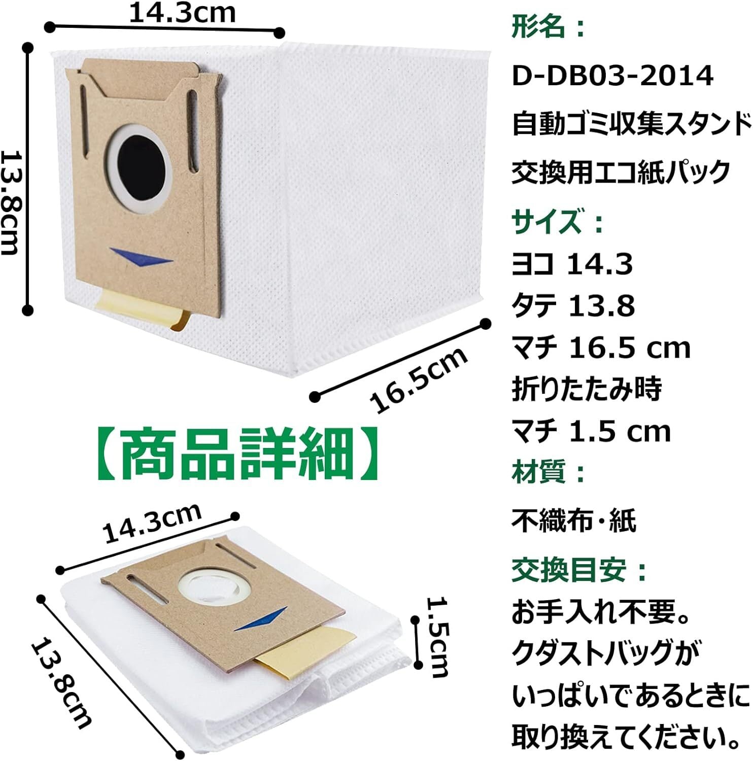 【形名】 D-DB03-2014 自動ゴミ収集スタンド 交換用エコ紙パック 。材質:不織布・紙。