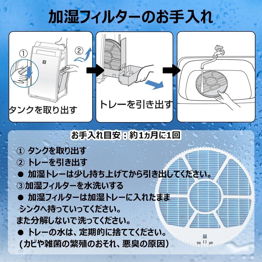 快適な湿度を保つ。FZ-E100MF 加湿フィルターはタンクからトレーに給水された水を吸い上げて、気化させることで、通過した空気を加湿して室内で快適に過ごせる湿度環境をつくります。室内での乾燥対策や暖房対策だけではなく、肌や髪の乾燥も防ぐことができます。