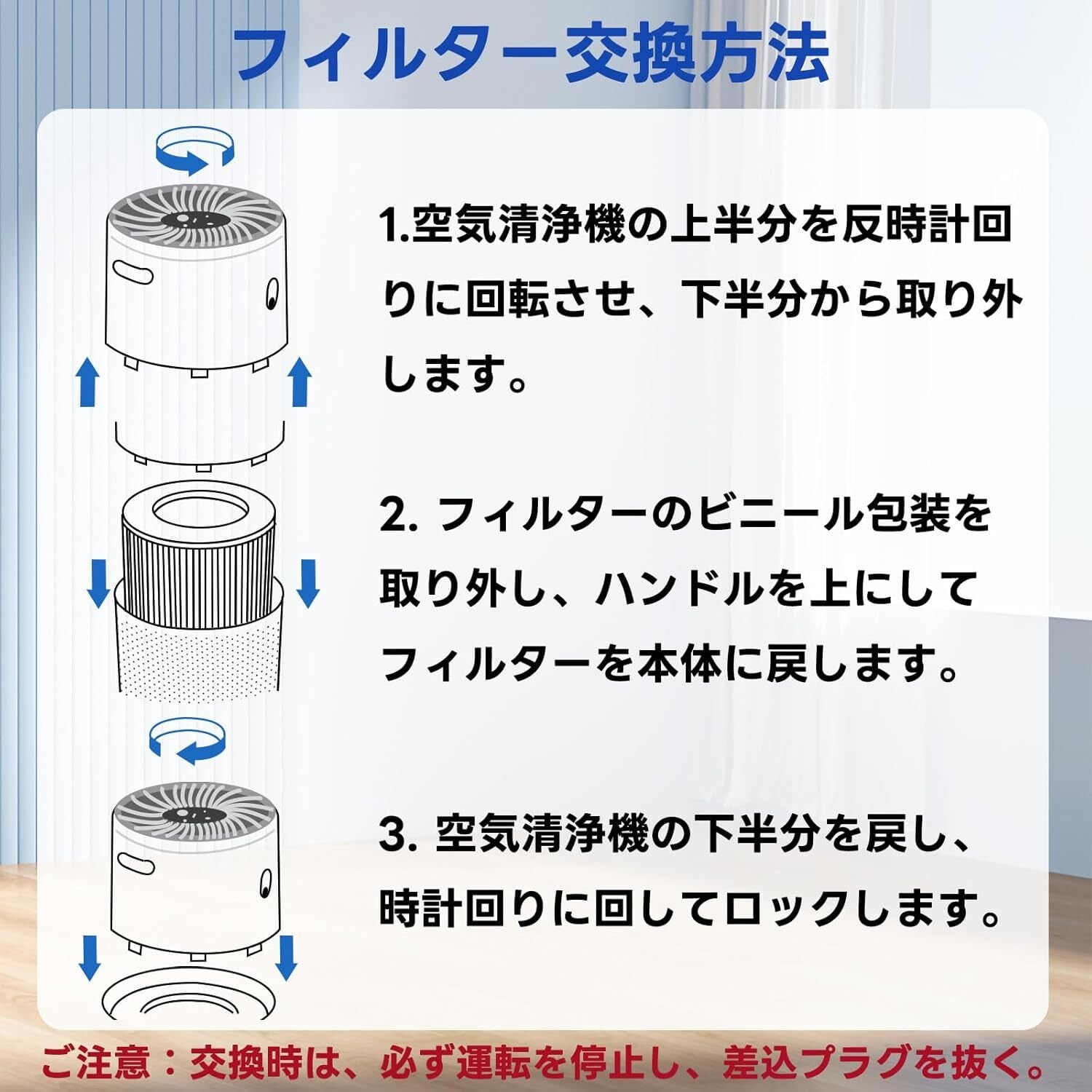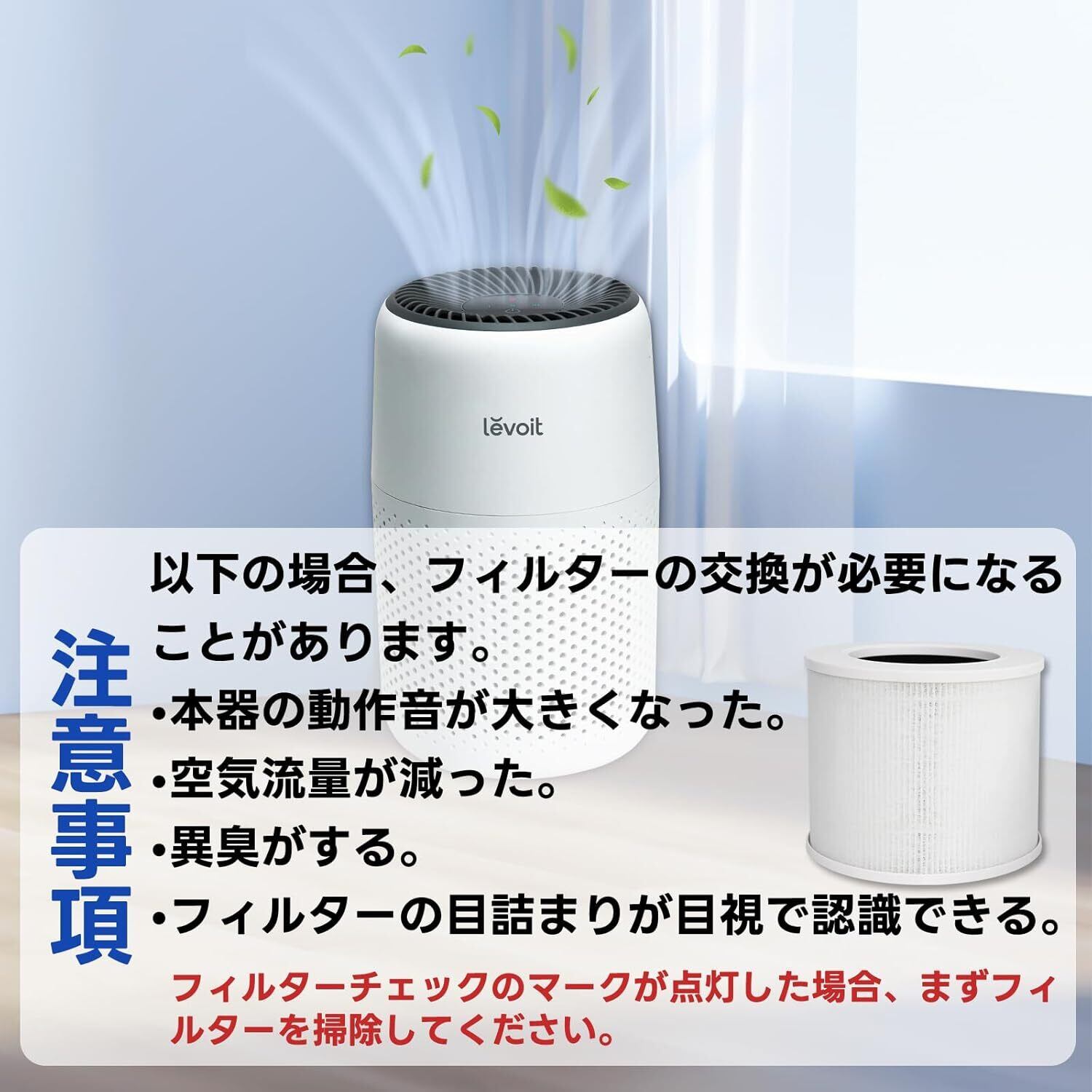 【注意事項】以下の場合、フィルターの交換が必要になることがあります。本器の動作音が大きくなった。空気流量が減った。異臭がする。フィルターの目詰まりが目視で認識できる。※フィルターチェックのマークが点灯した場合、まずフィルターを掃除してください。