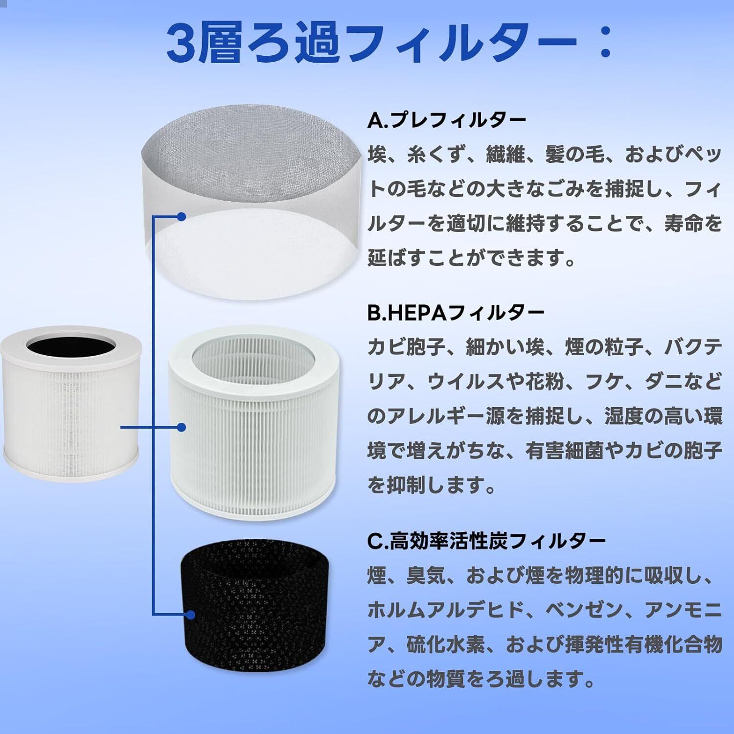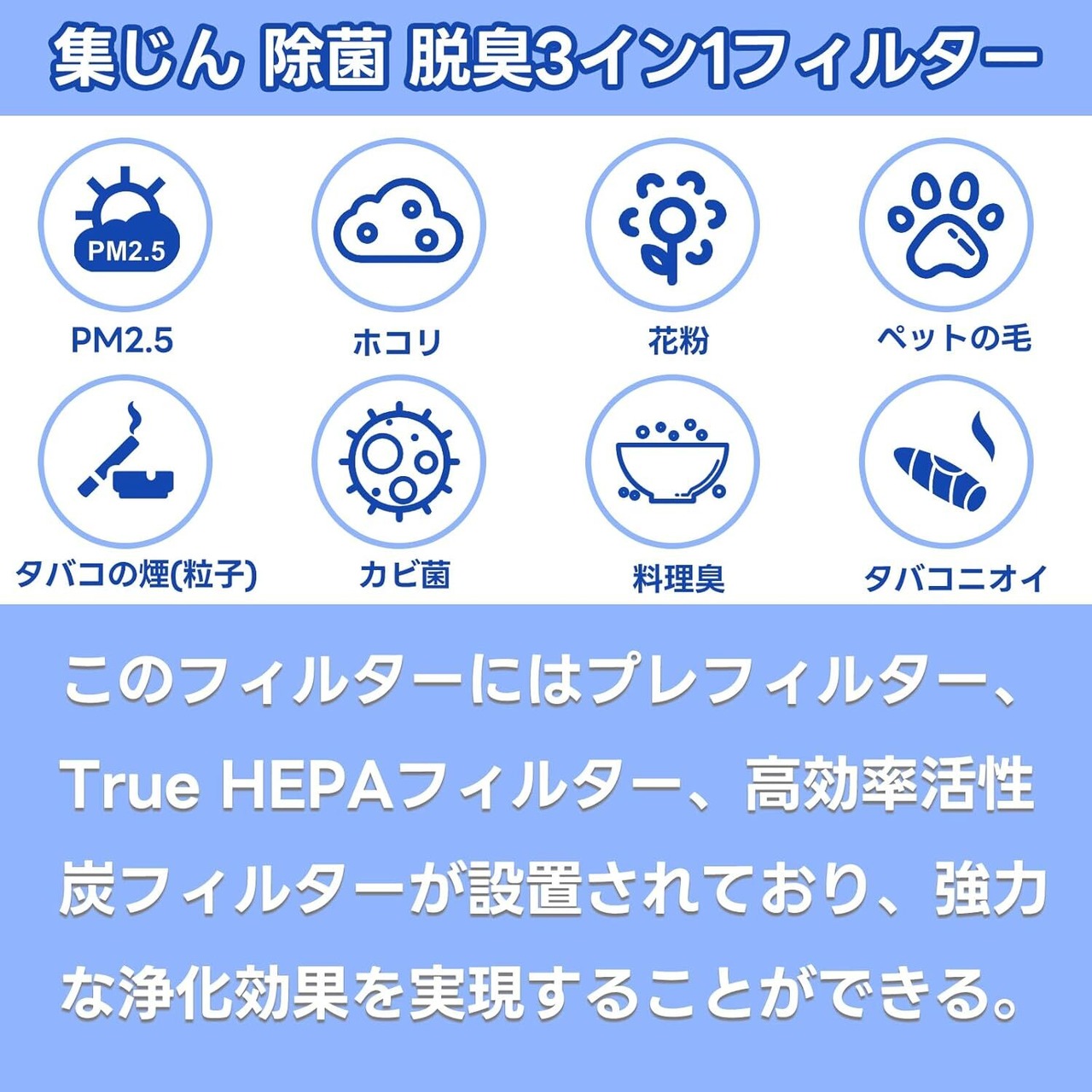 【集じん 除菌 脱臭3イン1フィルター】このフィルターにはプレフィルター、True HEPAフィルター、高効率活性炭フィルターが設置されており、強力な浄化効果を実現することができる。カビ胞子、細かい埃、煙の粒子、バクテリア、ウイルスや花粉、フケ、ダニなどのアレルギー源を捕捉し、湿度の高い環境で増えがちな、有害細菌やカビの胞子を抑制します。