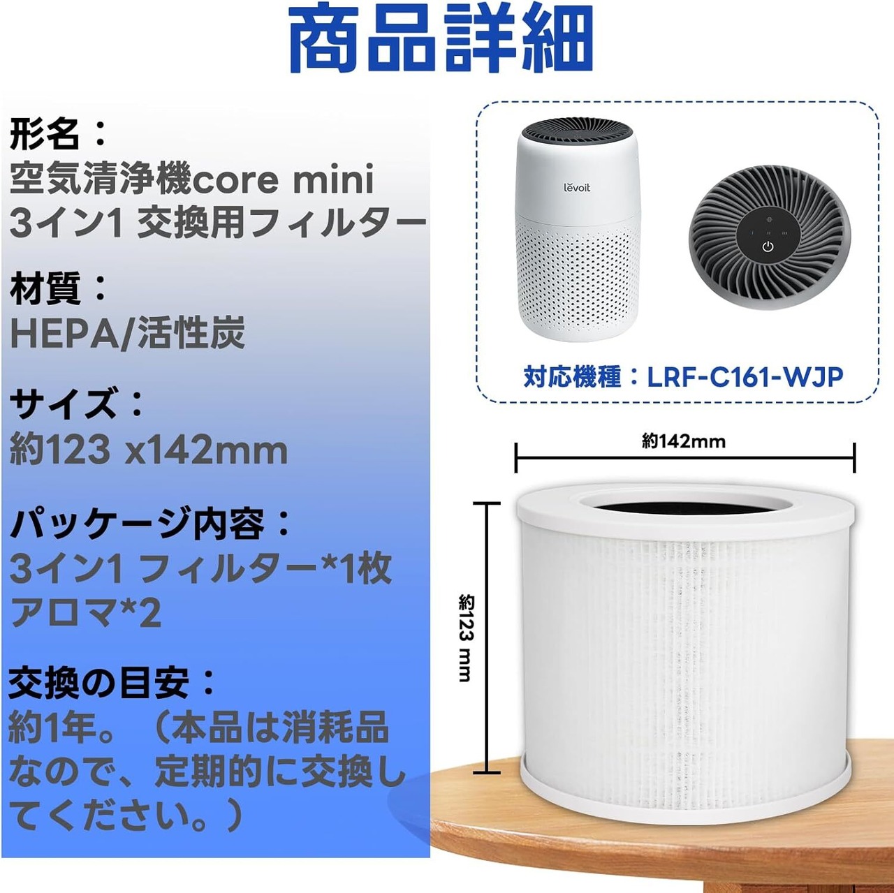【商品詳細】形名:空気清浄機core mini 3イン1 交換用フィルター 材質:HEPA/活性炭 サイズ:約123 x142mm パッケージ内容:3イン1 フィルター*1枚 アロマ*2 対応機種:LRF-C161-WJP 交換の目安:約1年。(本品は消耗品なので、定期的に交換してください。)