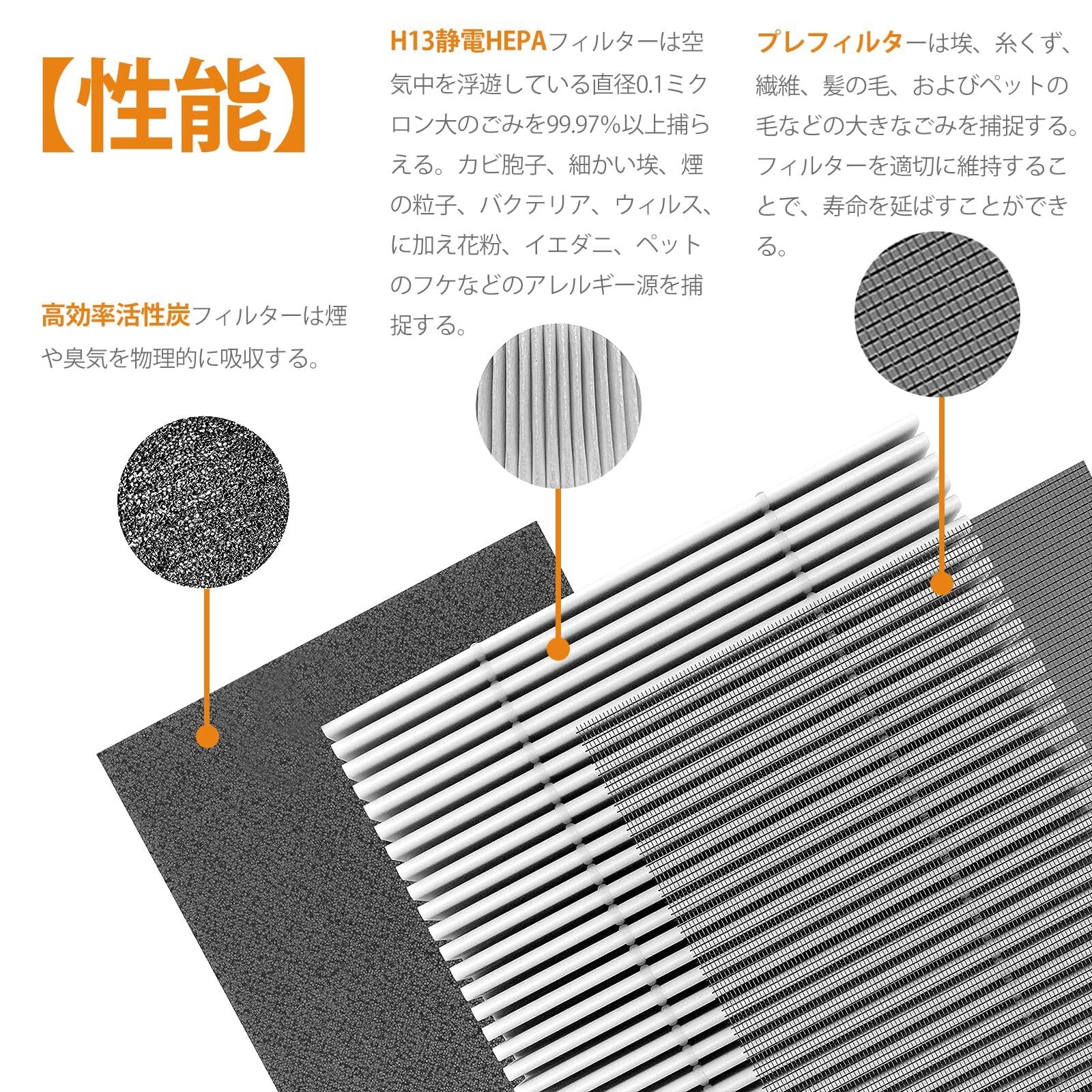 カビ胞子、細かい埃、煙の粒子、バクテリア、ウィルス、に加え花粉、イエダニ、ペットのフケなどのアレルギー源を捕捉する。カスタム高効率活性炭フィルターは煙や臭気を物理的に吸収する。
