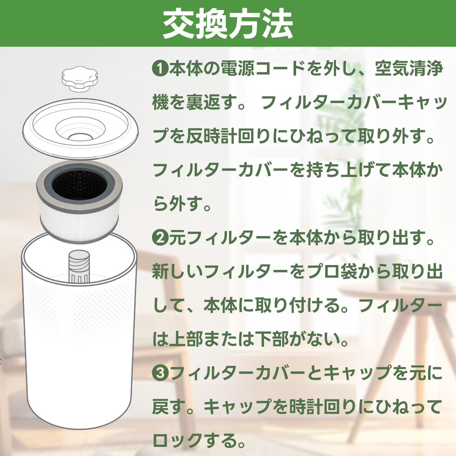 6~8か月ごとに交換する必要がある。フィルターの交換時期は、本器の使用頻度により多少変動する。より汚染度の高い場所で使用する場合、フィルタチェック表示が点灯していなくても、フィルタの交換頻度を高くする必要がある場合がある。