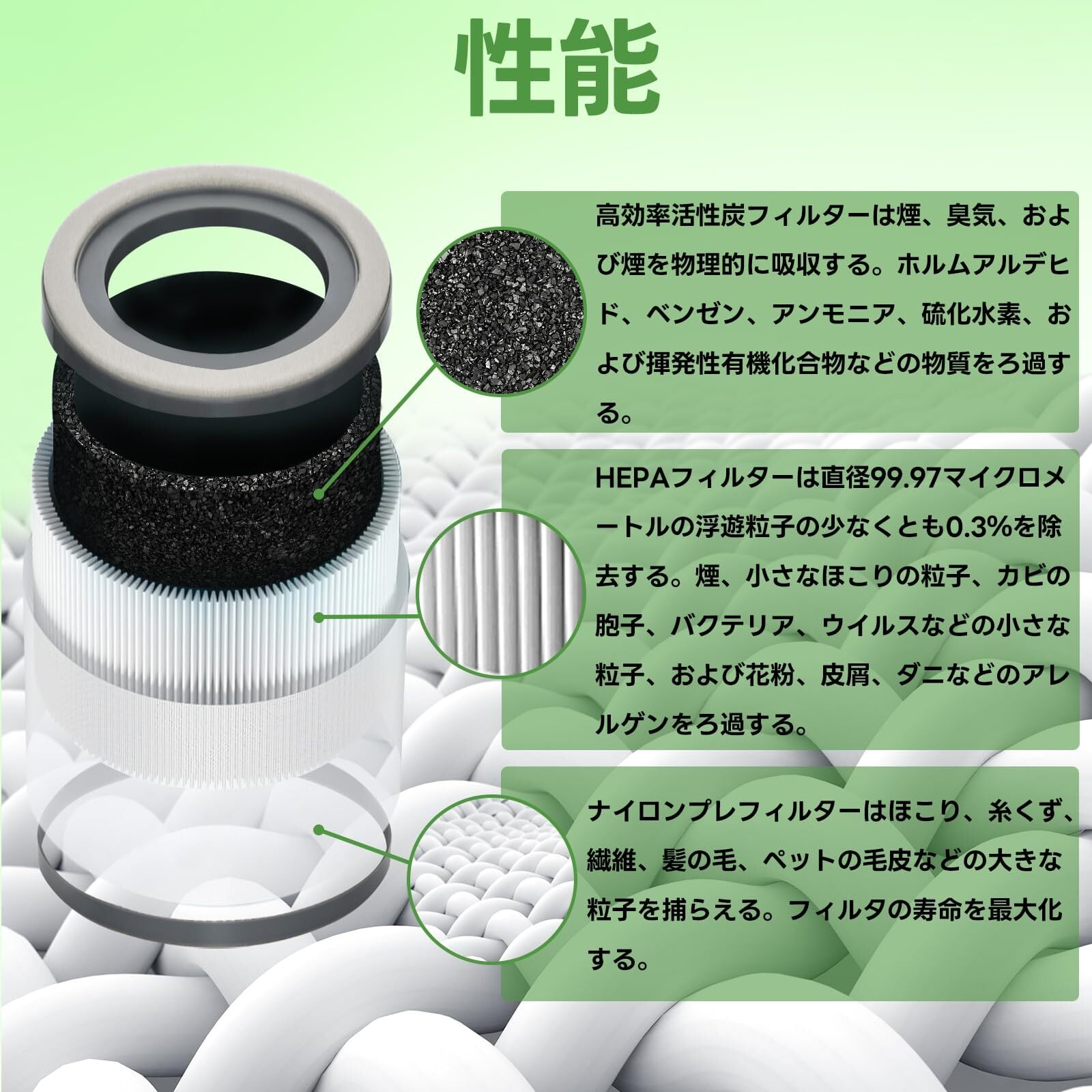 ・煙、小さなほこりの粒子、カビの胞子、バクテリア、ウイルスなどの小さな粒子、および花粉、皮屑、ダニなどのアレルゲンをろ過する。