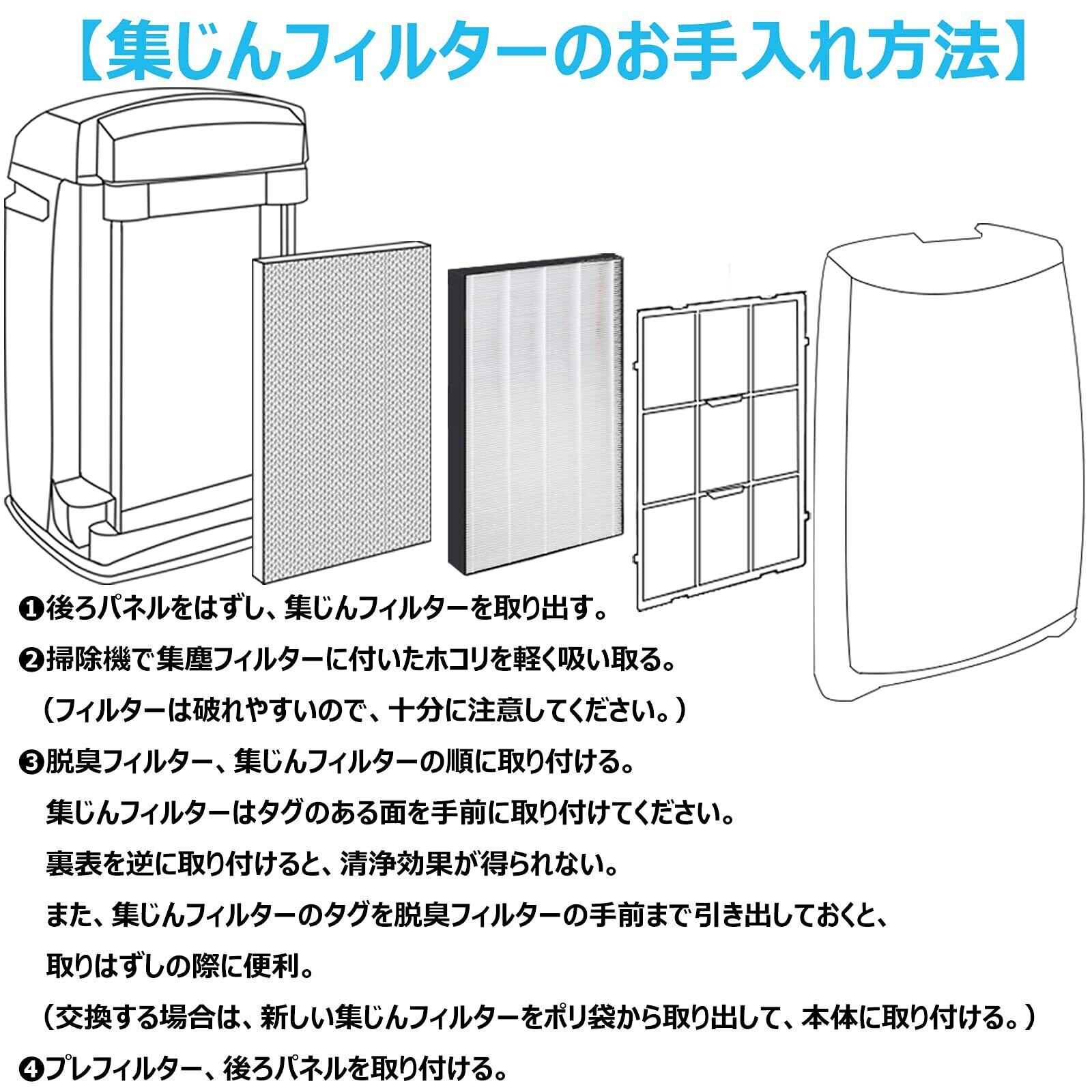★集じんフィルター。網目の細かさだけで粒子を捕集するタイプのHEPAフィルターに比べ、目詰まりしにくいため、集塵力が長持ちする。 しかし、使っているうちに集じん力が落ちて能力低下になる。定期的に交換することが必要。