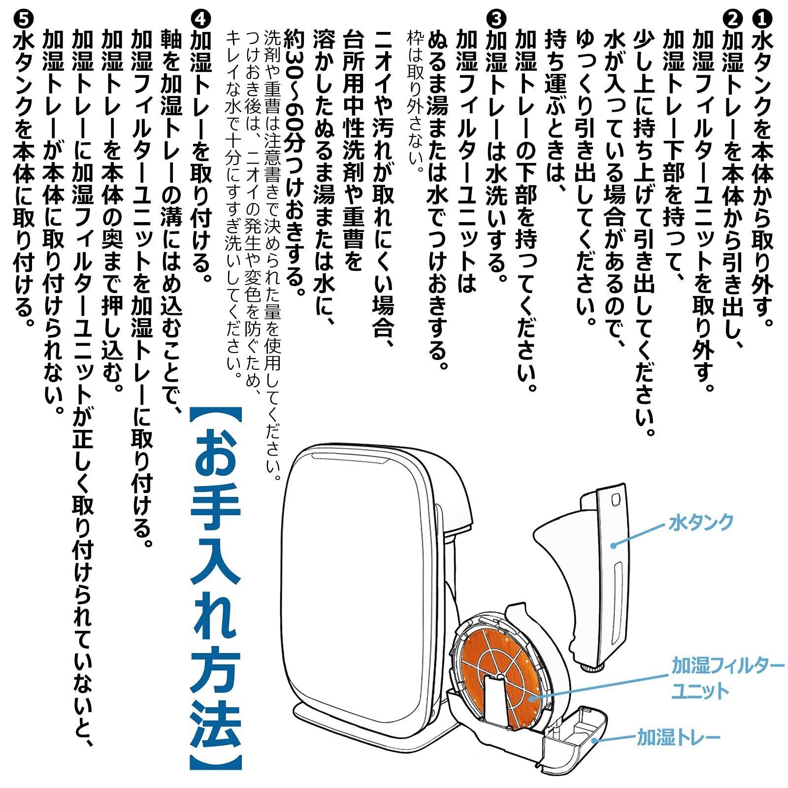 加湿フィルターは約1ヵ月に1度、またはニオイや汚れが気になるとき。脱臭フィルターは汚れが気になるとき。集塵フィルターは掃除機での掃除や、水洗いはしない。