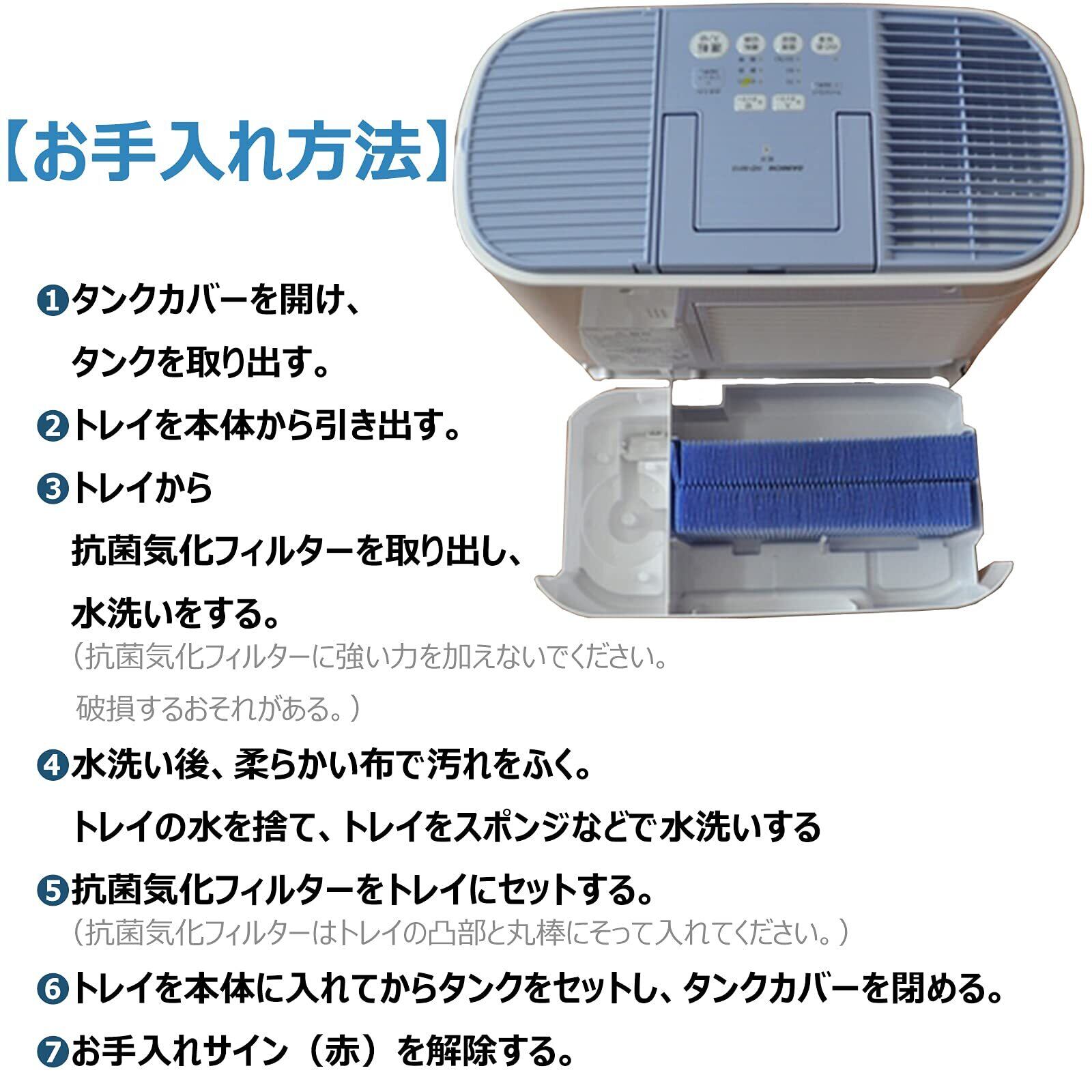 お手入れせずに使用を続けると固まって取れにくくなり、雑菌やカビが繁殖し悪臭が発生したり、加湿量の低下や送風音が大きくなる原因になるので必ずお手入れしてください。