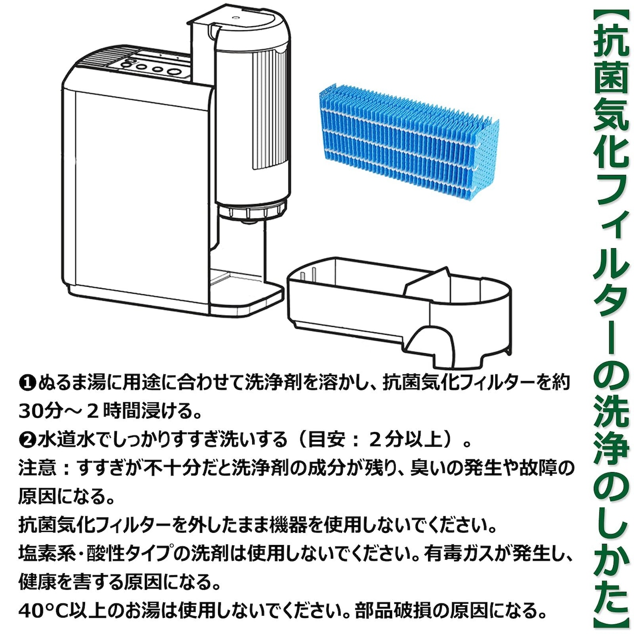 ■1カ月に1回クエン酸で洗浄する。抗菌気化フィルターに水アカが付着する。水アカは水道水に含まれるミネラル分が気化せずに残ったもの。お手入れせずに使用を続けると固まって取れにくくなり、雑菌やカビが繁殖し悪臭が発生したり、加湿量の低下や送風音が大きくなる原因になるので必ずお手入れしてください。
