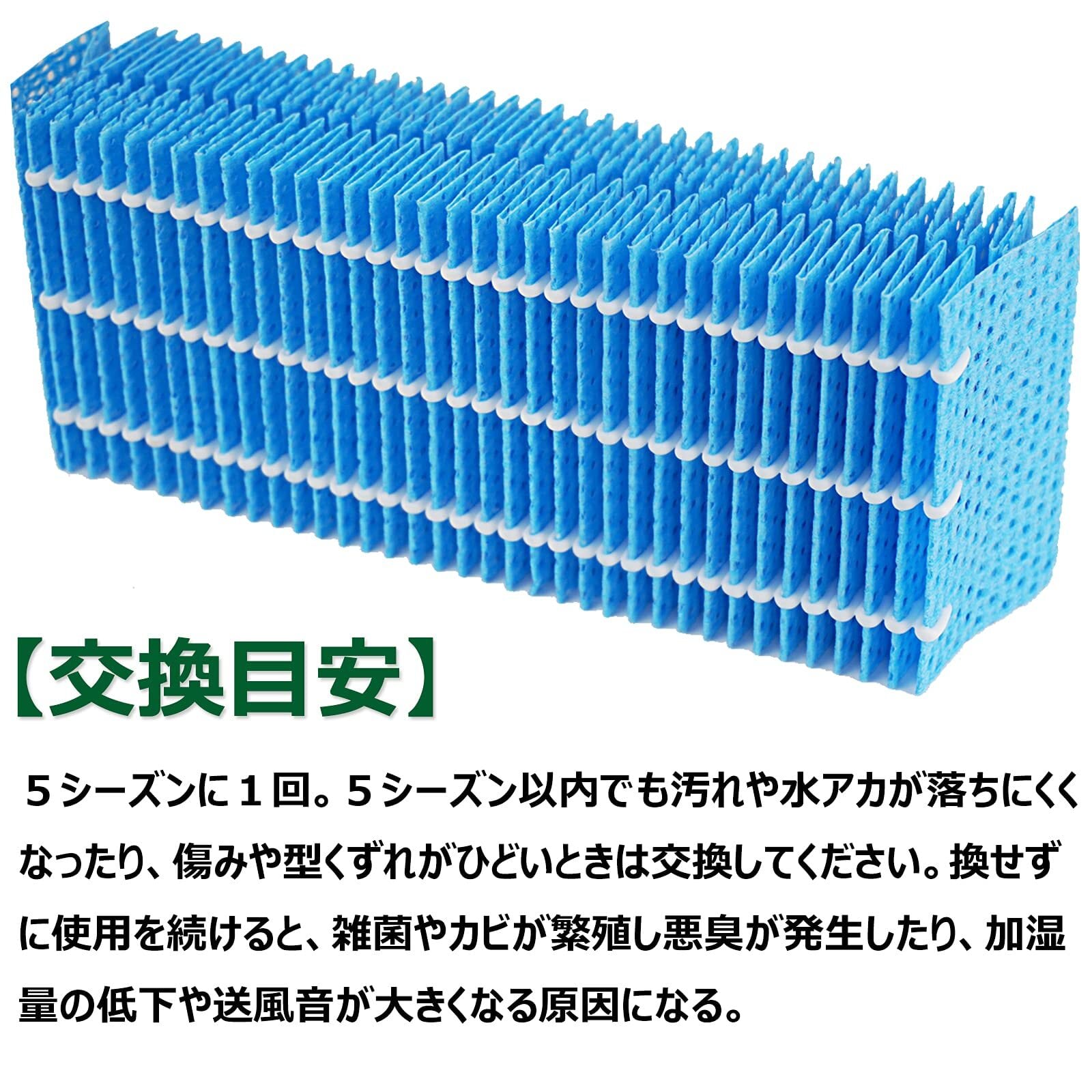 ■5シーズン以内でも汚れや水アカが落ちにくくなったり、傷みや型くずれがひどいときは交換してください。換せずに使用を続けると、雑菌やカビが繁殖し悪臭が発生したり、加湿量の低下や送風音が大きくなる原因になる。