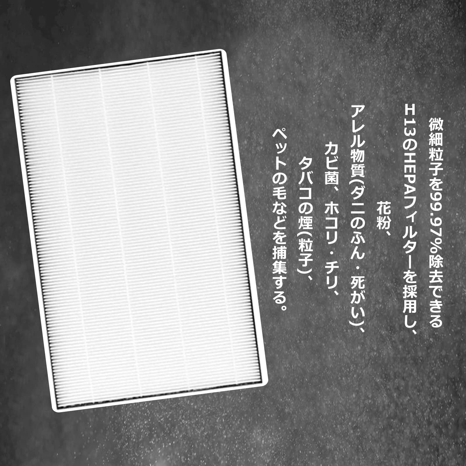 ・集塵フィルターは微細粒子を99.97%除去できるH13のHEPAフィルターを採用し、花粉、アレル物質(ダニのふん・死がい)、カビ菌、ホコリ・チリ、タバコの煙(粒子)、ペットの毛などを捕集する。