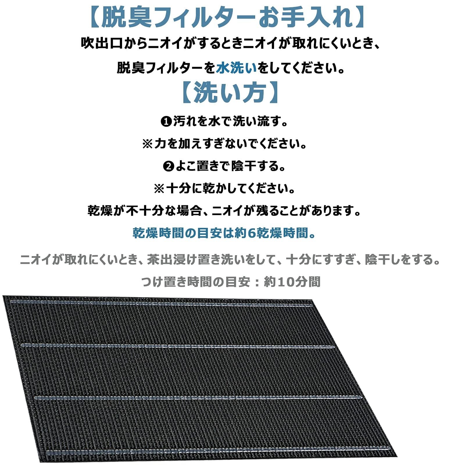 吹出口からニオイがするとき、ニオイが取れにくいとき。ホコリが付着したら、掃除機で軽く集じんフィルターを吸い取って、脱臭フィルターを水で洗ってください。