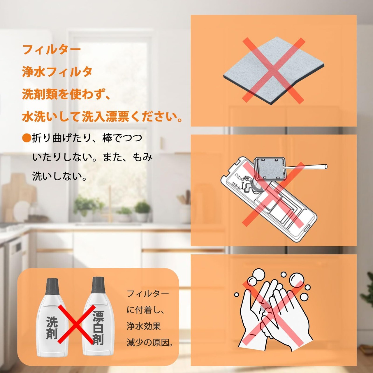 給水タンクや製氷皿は、洗剤や漂白剤などで洗わないでください