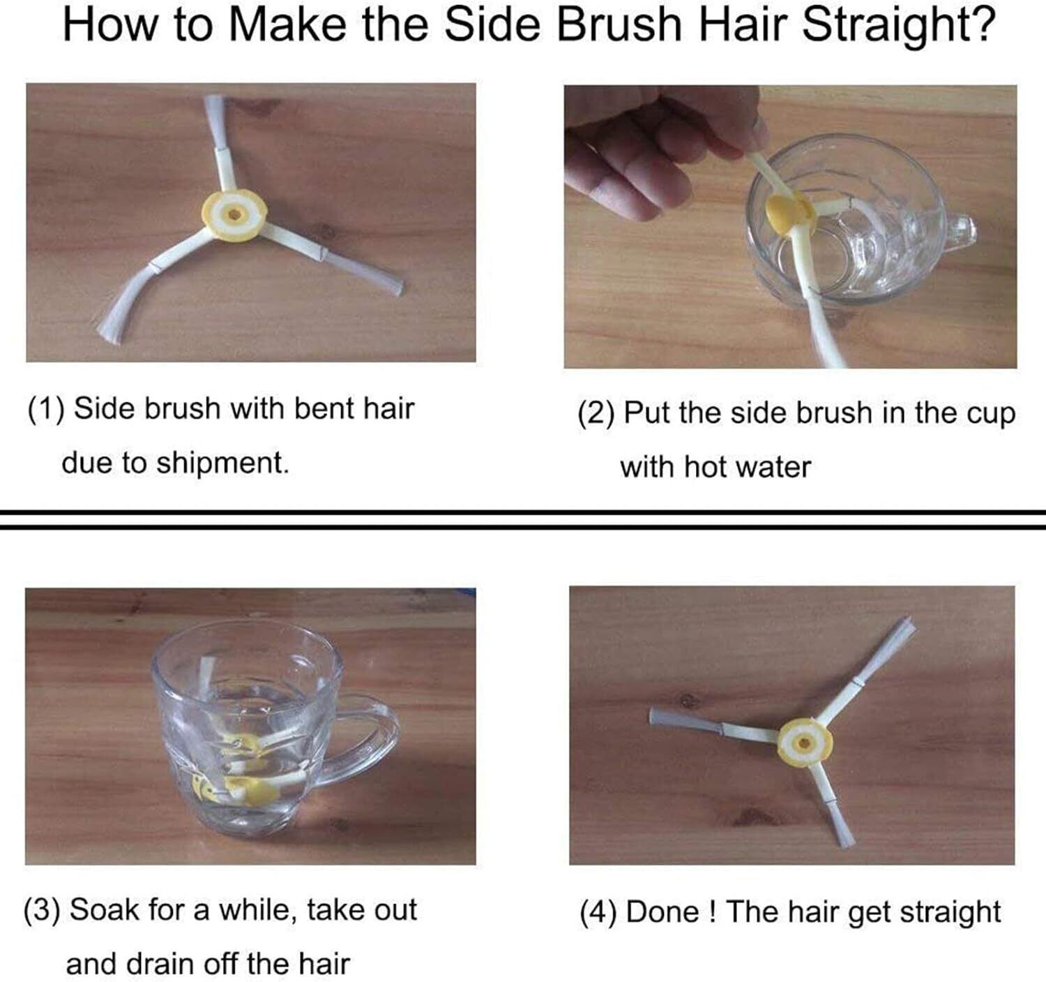 輸送中の影響により、ブラシの毛が曲がる場合があります。その場合は、温かいお湯に約4分ほど浸し、取り出して水気をよく取ってください。ブラシの毛は元のまっすぐな状態に戻ります。